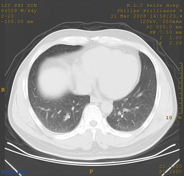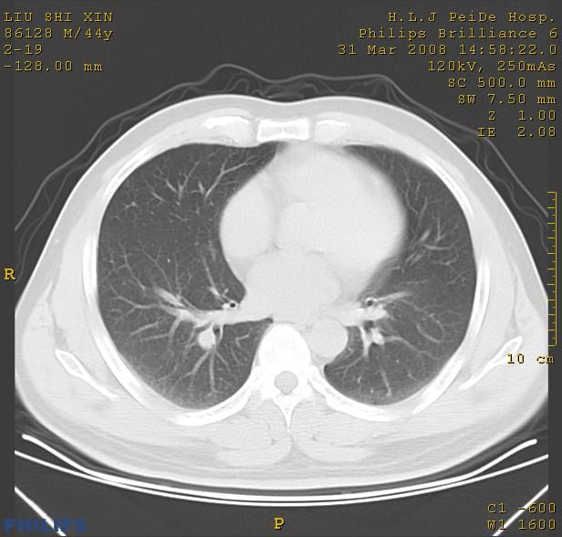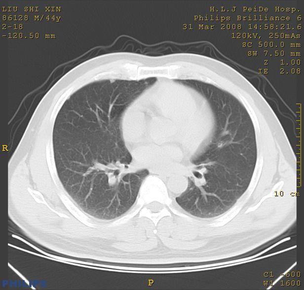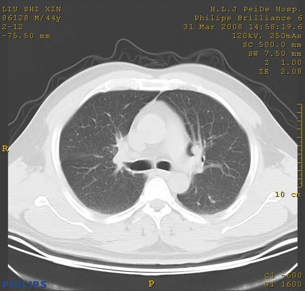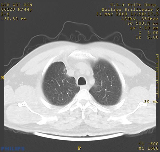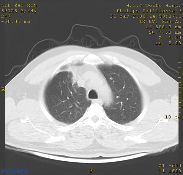 以下是引用前行在2008-4-27 11:27:00的发言:[br]瘢痕挛缩,胸膜牵拉,血管纠集扭曲,上叶前段支气管显示欠清,周围散在斑片影,以纵隔旁肺癌可能性大。请穿刺检查。