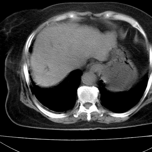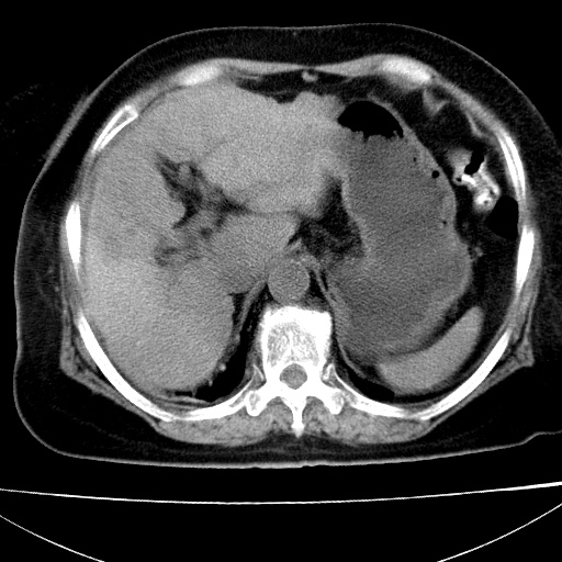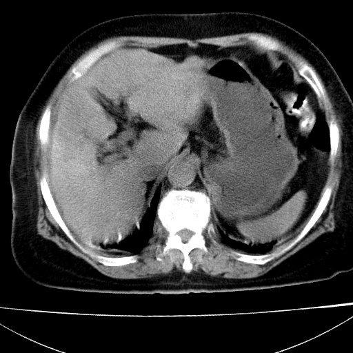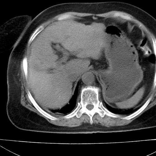 肝脏体积缩小,肝裂增宽,边缘不平呈波浪状,肝右叶见分隔状条索形钙化,亦见多结节低密度灶,边界不清,肝周可见少许液性暗区,胆囊增大内密度均匀,脾脏下缘低于脏脏的下缘,胸腔亦见液性暗区,余未见明显异常.