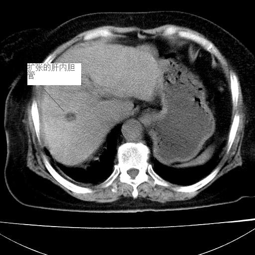 肝内圆形低密度影考虑扩张的胆管