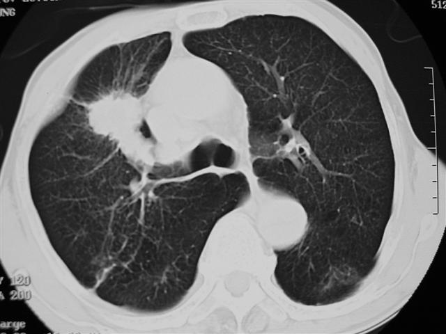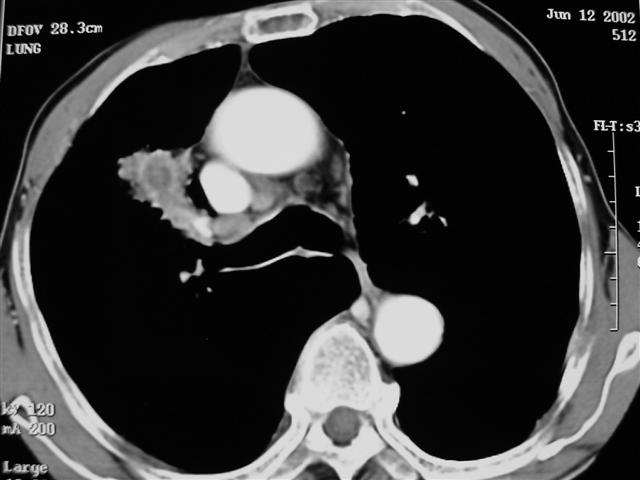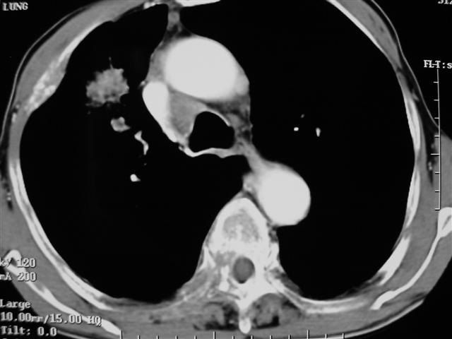 以下是引用随光逐影在2008-4-28 7:28:00的发言:[br]1)右肺上叶前段周围型肺癌并阻塞性肺炎、右肺门及纵隔淋巴结转移、肋骨及胸椎转移。2)右肺上叶后段纤维病灶。