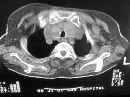 右肺炎性变,双侧甲状腺肿,胸膜肥厚。