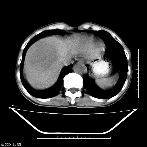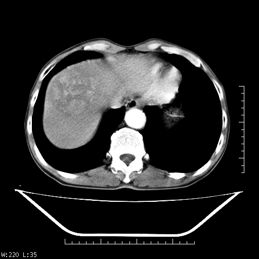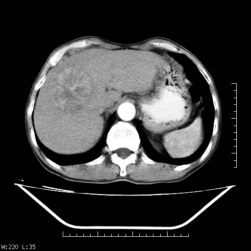 肝右叶类圆型密度减低影,密度不均,边界清晰其内可见更低密度影,腹膜后可见小淋巴结肿大,增强扫描动脉期病灶明显强化,静脉期及延时扫描见强化不明显,快进快出表现。