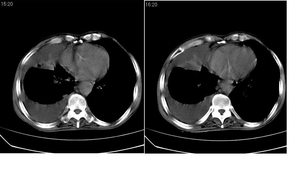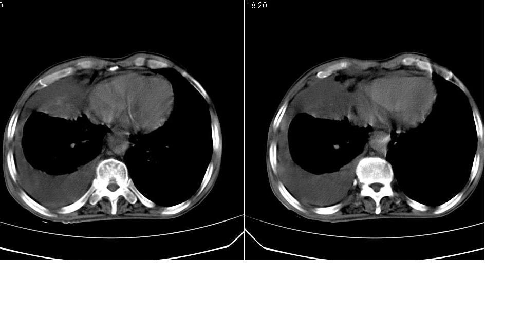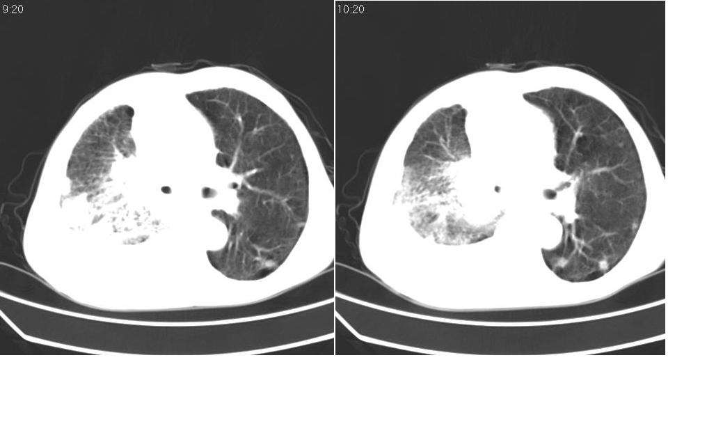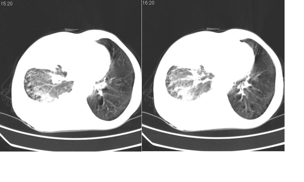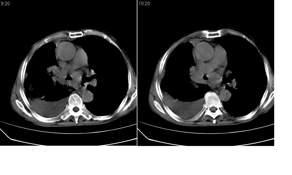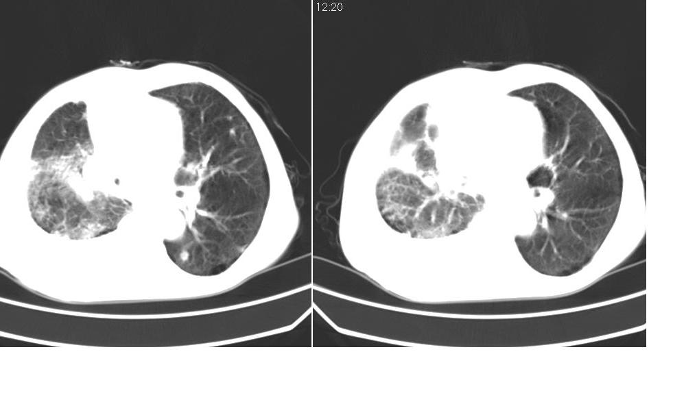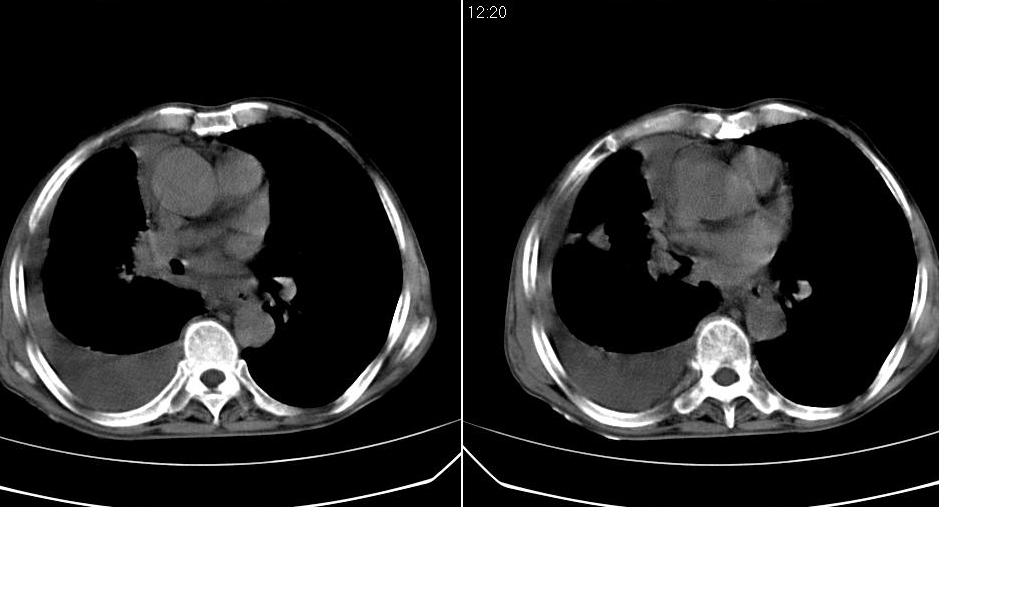 以下是引用mzh123在2008-5-3 21:12:00的发言:[br]本人持有不同观点[br]1、右肺似有团块表现,但只有一个层面,所以本人认为还是以片为主,所以不能首先考虑肿瘤[br]2、右肺普遍成纤维化改变 并伴有片状炎症改变,和癌性淋巴管炎表现不同[br]3、所以本人认为是间质纤维化伴感染可能大 及胸腔积液