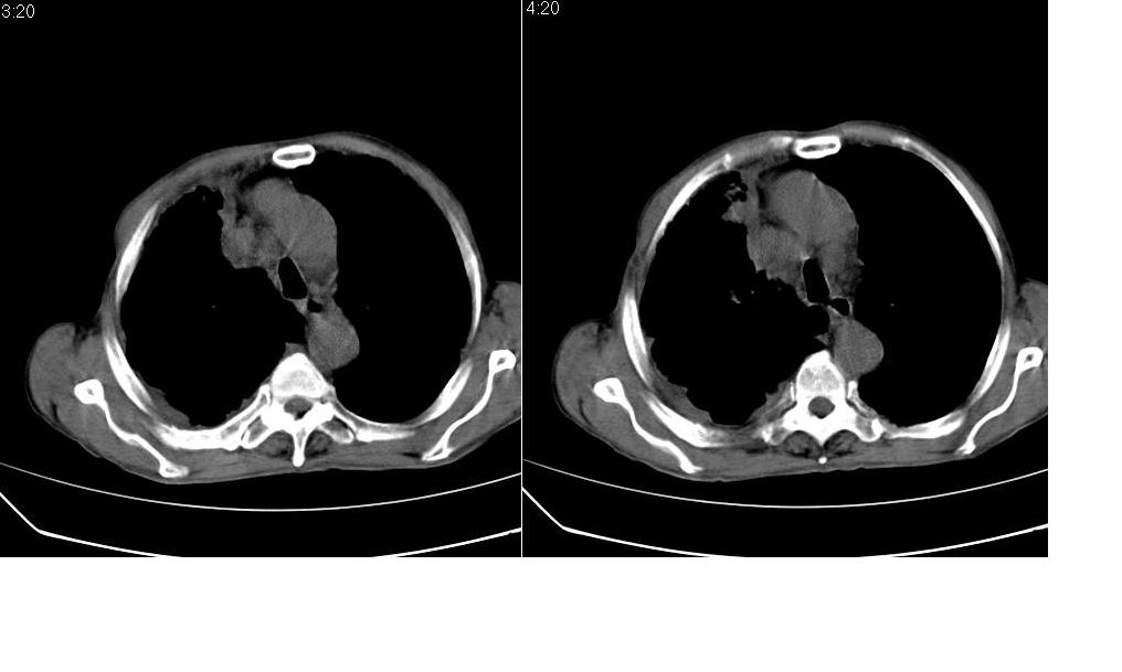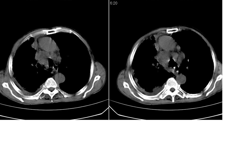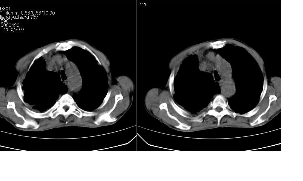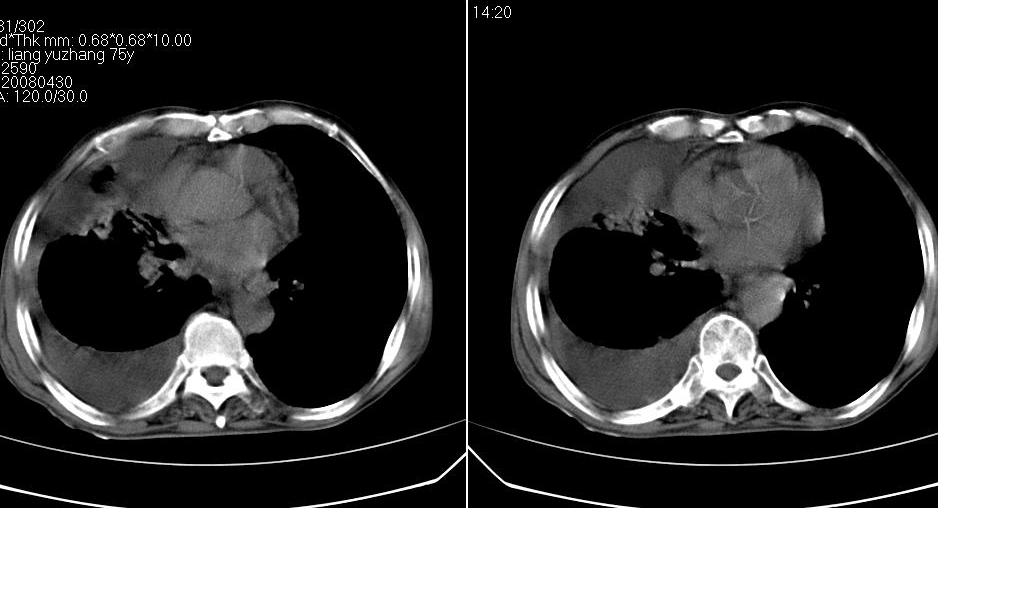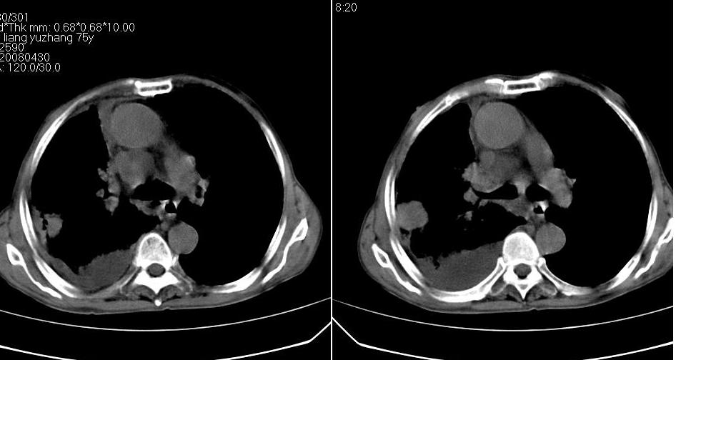 以下是引用liuyue在2008-5-3 20:49:00的发言:[br]1.右侧中心型肺癌伴双肺转移瘤、纵隔淋巴结转移、右侧胸腔积液(侵及胸膜所致可能性大)。[br]2.右肺阻塞性肺炎,癌性淋巴管炎不除外。