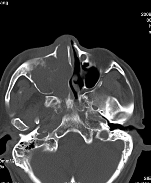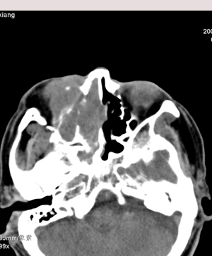 以下是引用影象小辈在2008-5-4 13:34:00的发言:[br]鼻腔及右侧上颌窦 筛窦内软组织密度影, 相邻鼻中隔、鼻甲及窦壁骨质破坏吸收,病灶延伸至鼻咽腔及右侧眼眶 多考虑为1.乳头状瘤 2.息肉 建议增强及活检