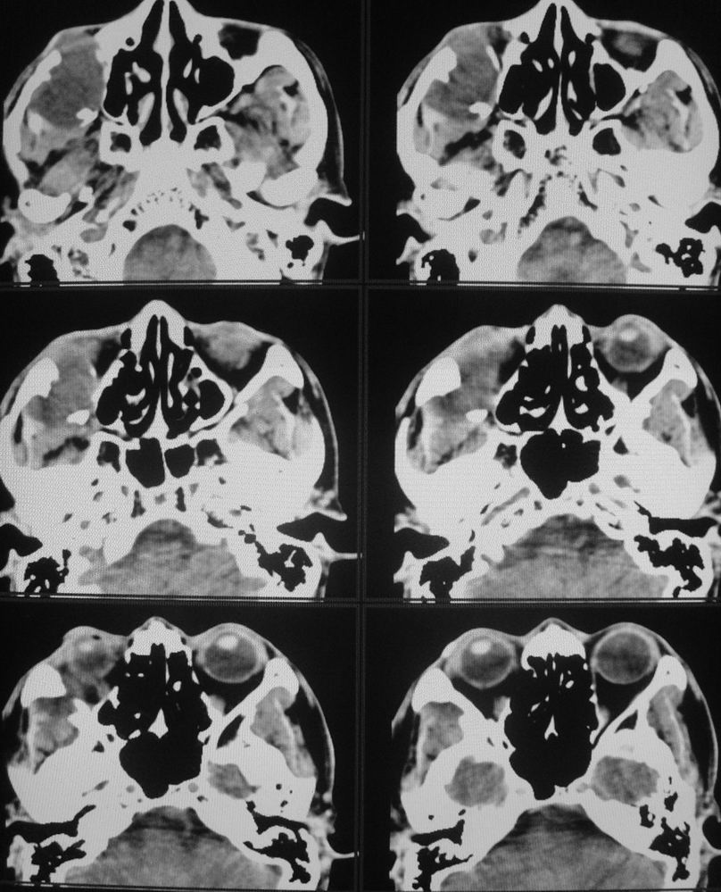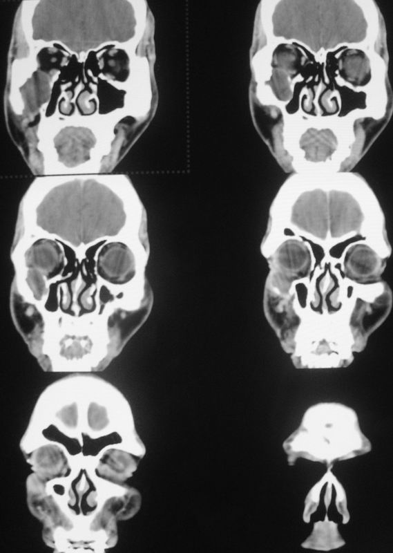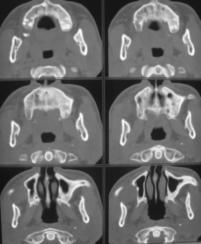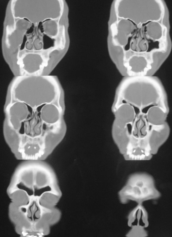以下是引用zsl6918在2008-5-6 14:41:00的发言:[br]右侧颞下窝内囊性占位(增强未见强化),同侧上颌窦受压变形移位,提示慢性过程。右侧上颌骨局限性吸收破坏,提示良性病变。