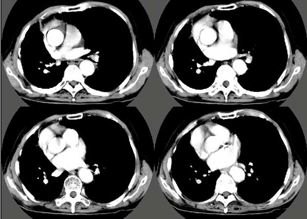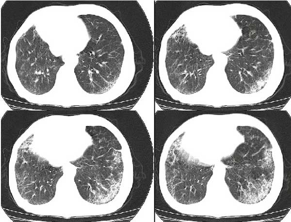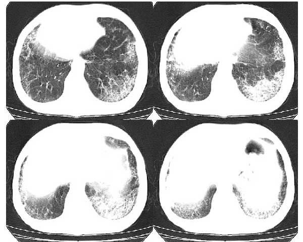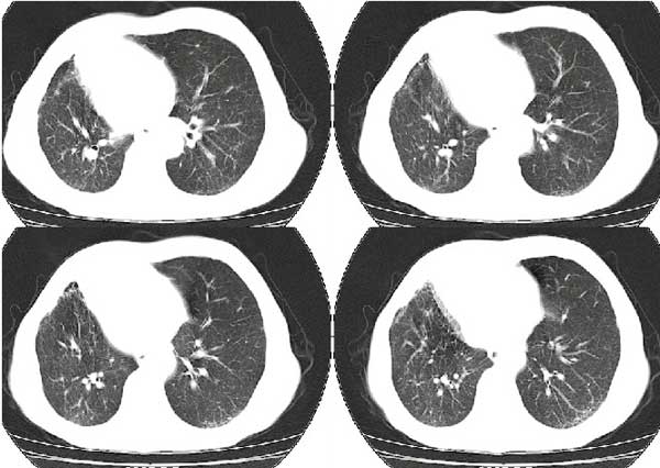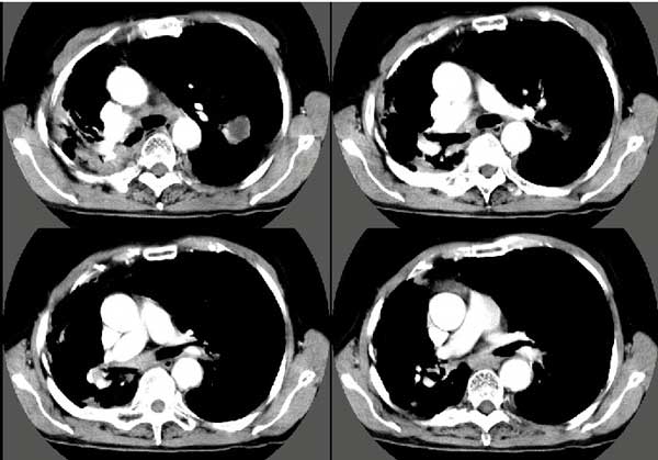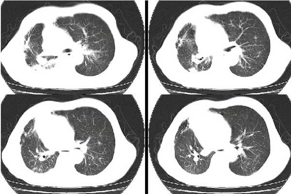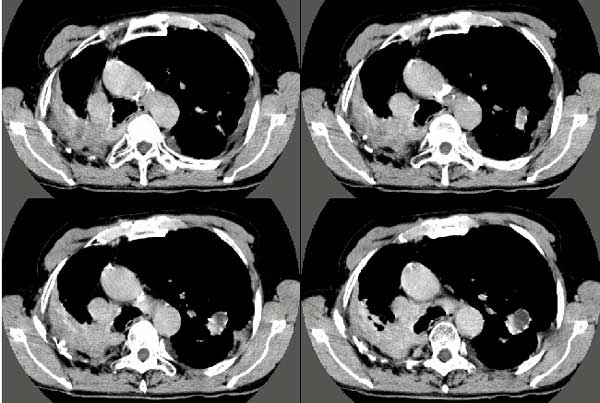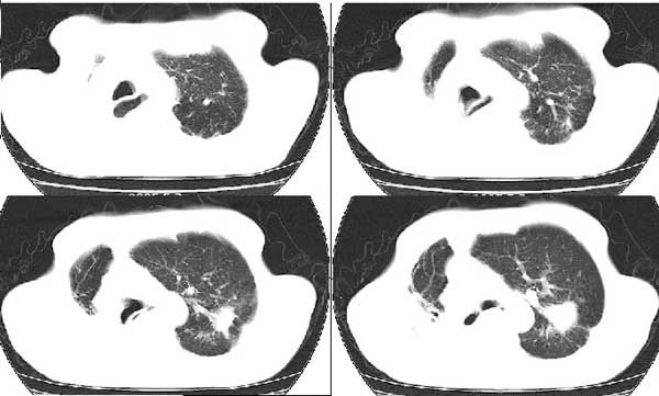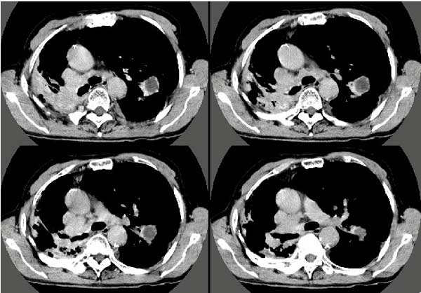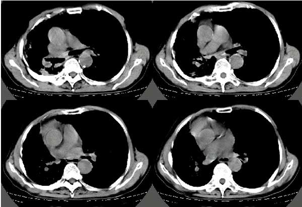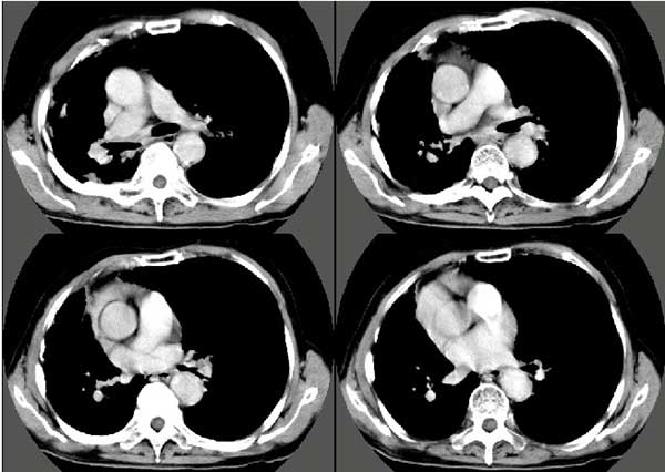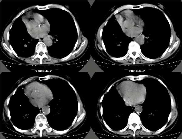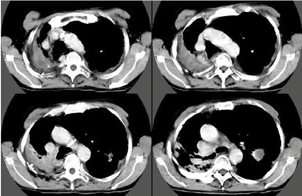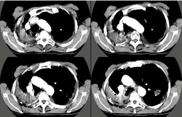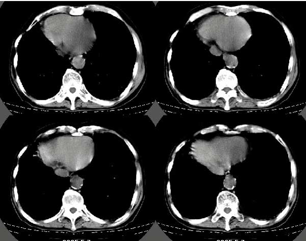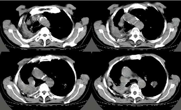以下是引用扬仪在2005-5-12 20:46:40的发言:[br]右肺呈术后改变;双侧肺野散在分布斑片状、点状高密度病灶,(似可见“树芽征”);左上尖后段见斑团状高密度病灶(2个层面?),边缘毛糙,段性分布,与斜裂相邻,临近胸膜粘连;增强示病灶边缘强化,内呈水样密度;心影、纵隔右移,内可见4r淋巴结肿大。[br]意见:1、双肺继发性肺结核,左上为干酪病灶;[br] 2、矽肺合并感染;[br] 3、建议抗痨+抗炎。 [br]愚人之见,请高人指教!