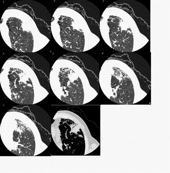 首先考虑炎性改变(结核),不除外周围性肺癌 肺间质增生部分纤维化 支气管扩张并感染