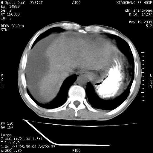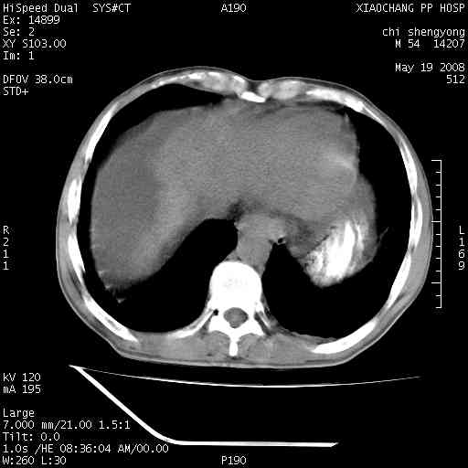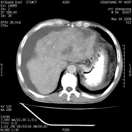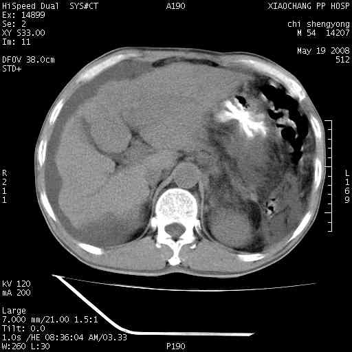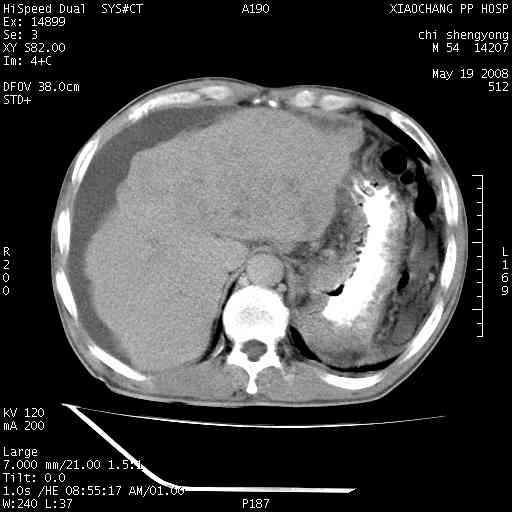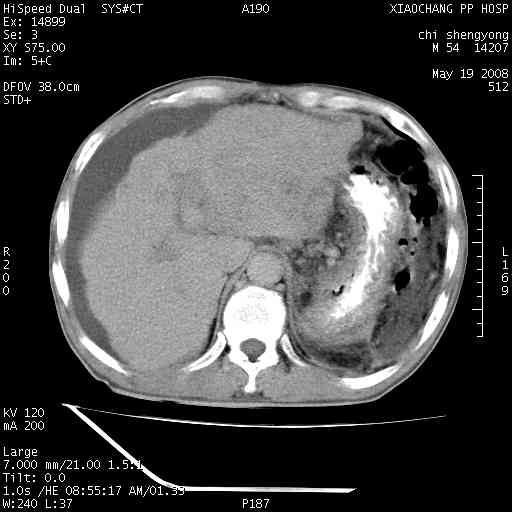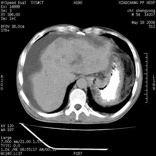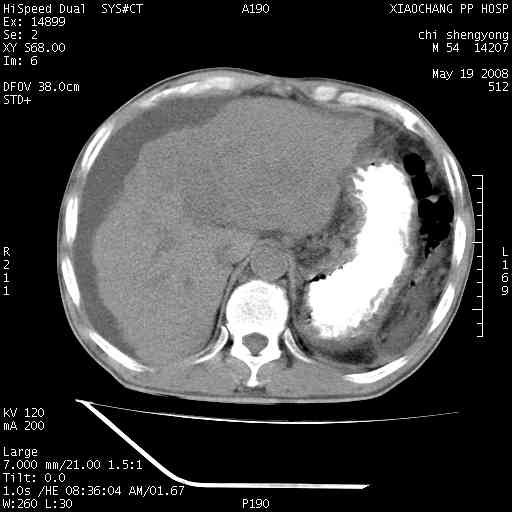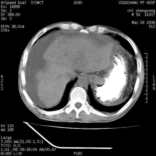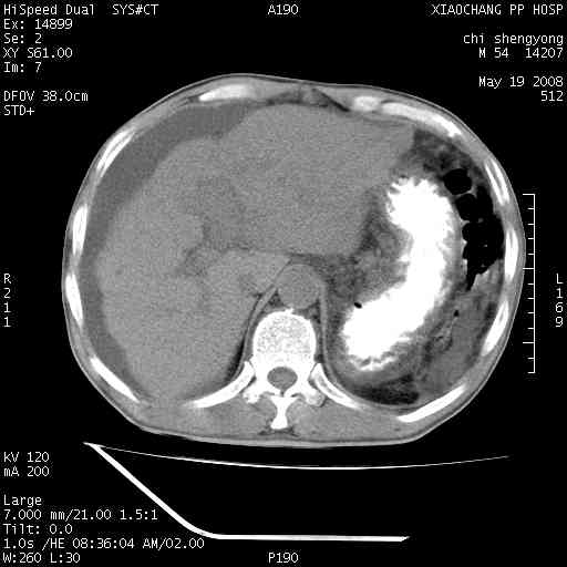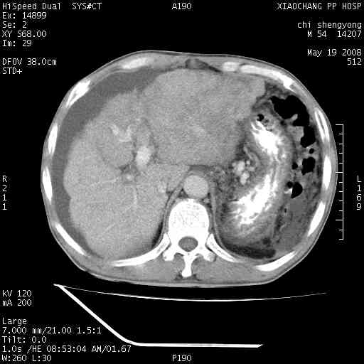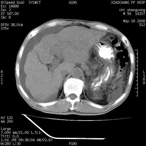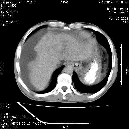 以下是引用zjzjr在2008-5-21 10:52:00的发言:[br]肝左叶巨块型肝癌伴门静脉左支瘤栓形成.肝硬化、腹水,胃底静脉曲张,脾术后改变。