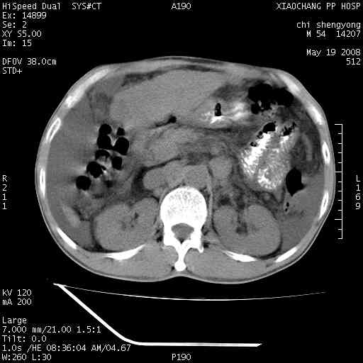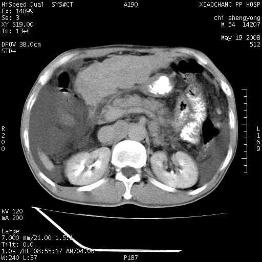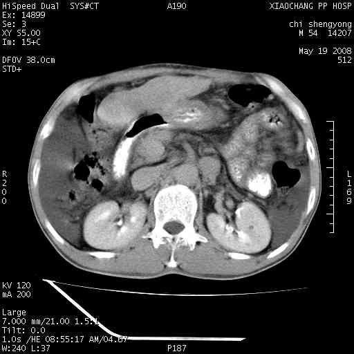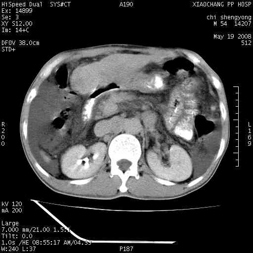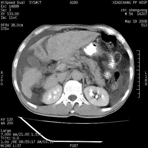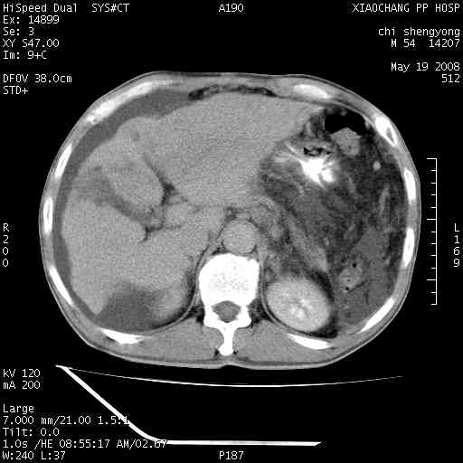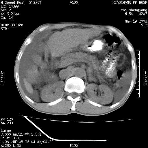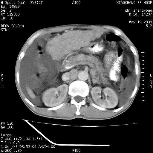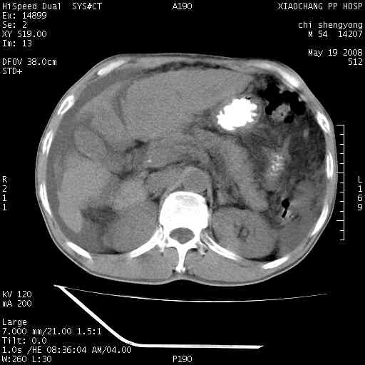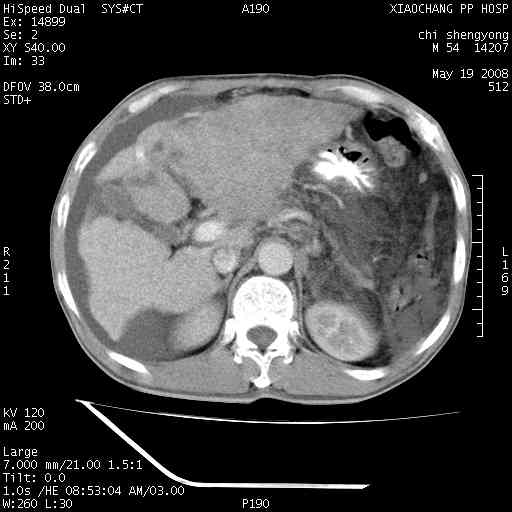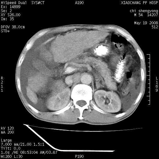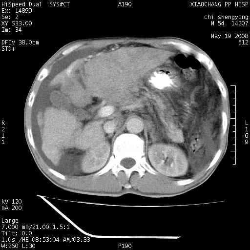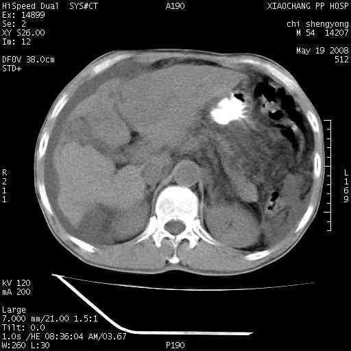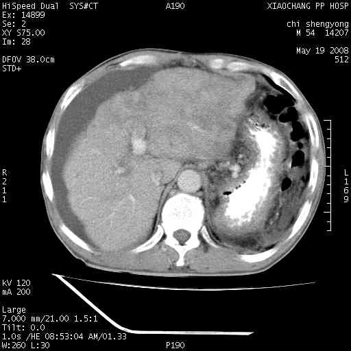以下是引用随光逐影在2008-5-21 16:20:00的发言:[br]1)肝左叶肝癌伴门静脉左支瘤栓形成,腹膜后淋巴结转移。2)肝硬化、腹水、胃底静脉曲张。3)胆囊炎。4)脾脏缺如,为切除术后所致。
