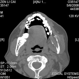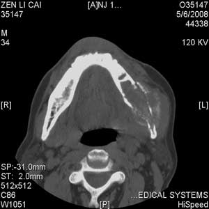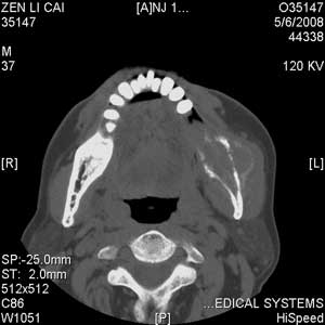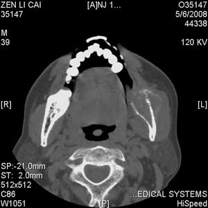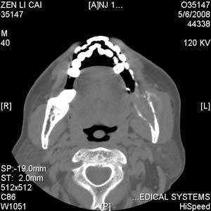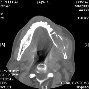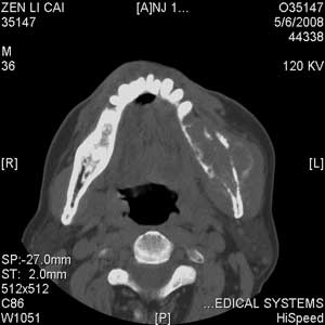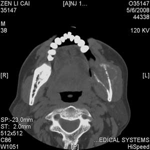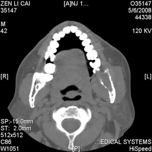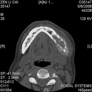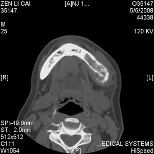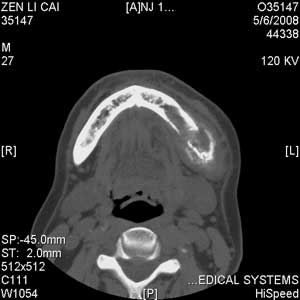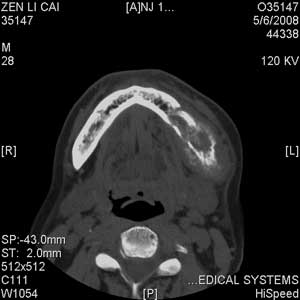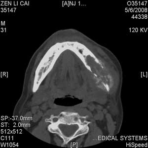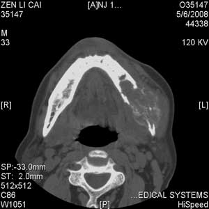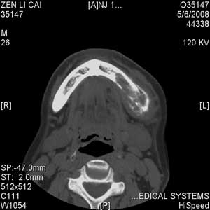 以下是引用jiangjing在2008-5-28 15:56:00的发言:[br]下颌骨左侧部骨质破坏,轻度膨胀,瘤骨形成,软组织肿胀考虑 恶性骨肿瘤-----肉瘤类