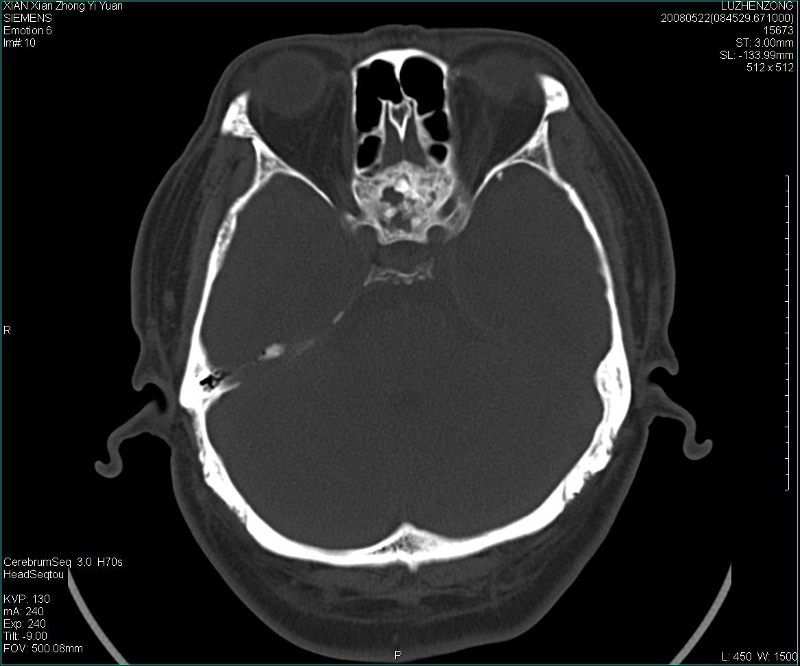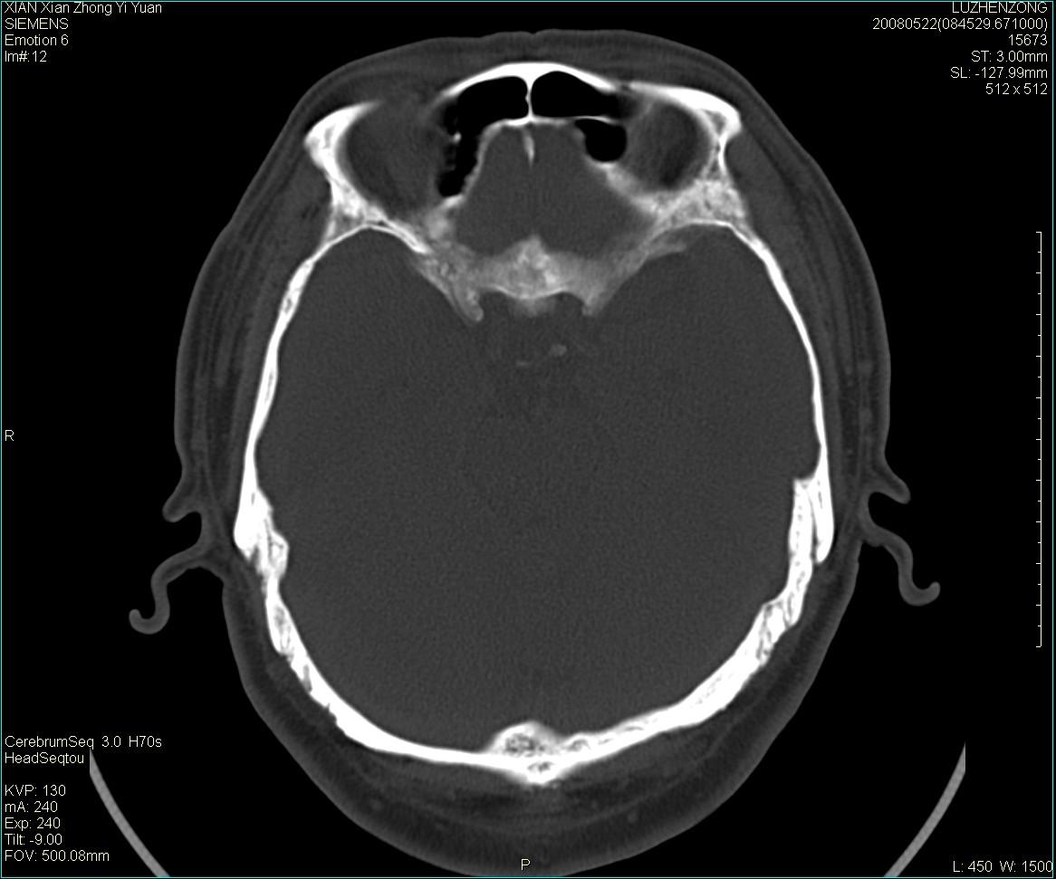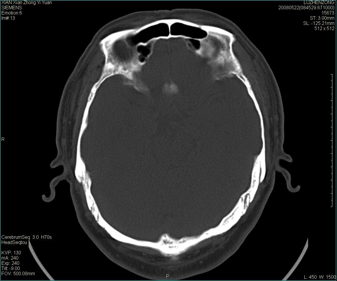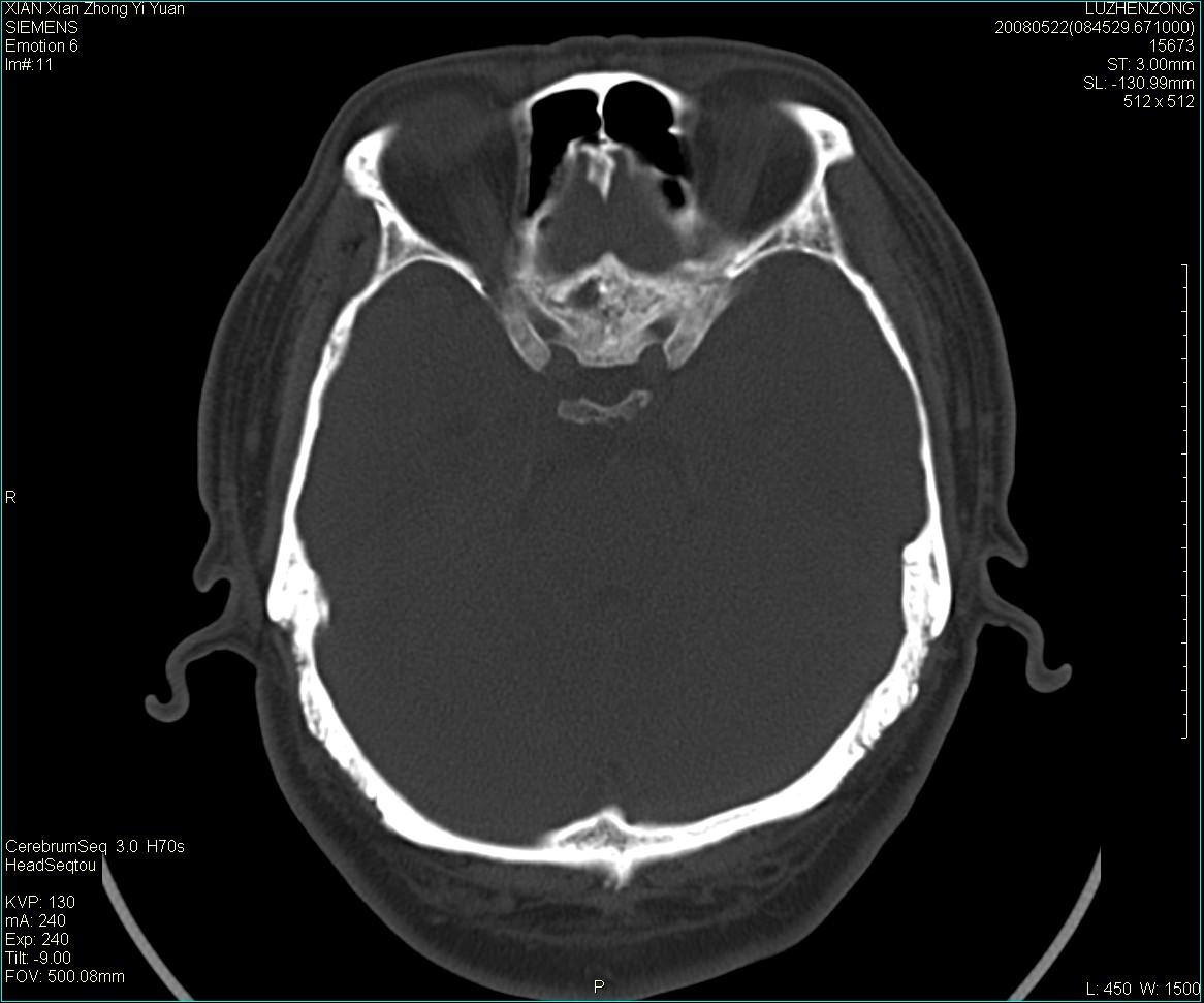 以下是引用卜一在2008-5-28 20:46:00的发言:[br]中颅窝“骨纤维异常增殖症”。不除外考虑来源于蝶骨前床突区“骨软骨瘤”。[br]