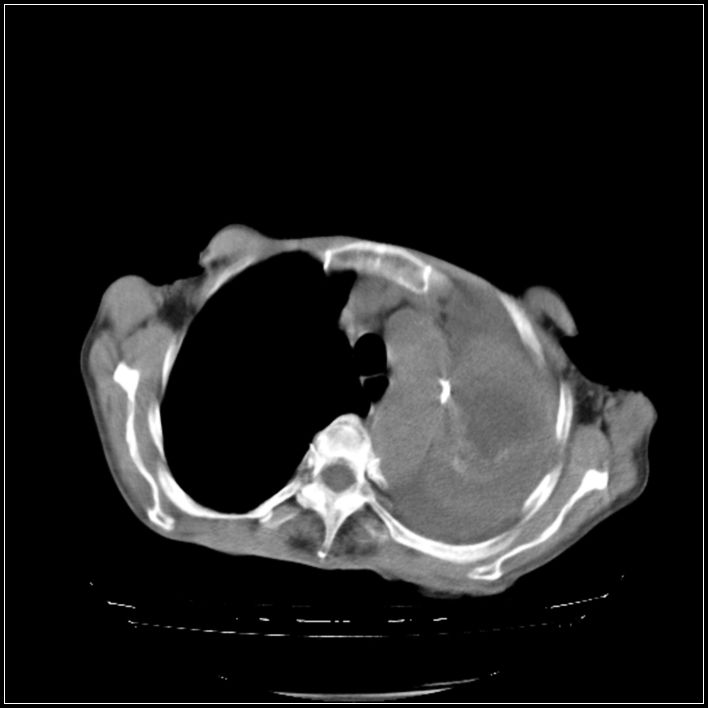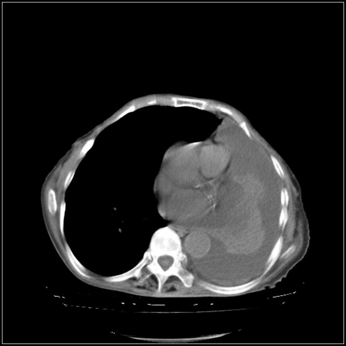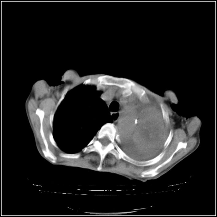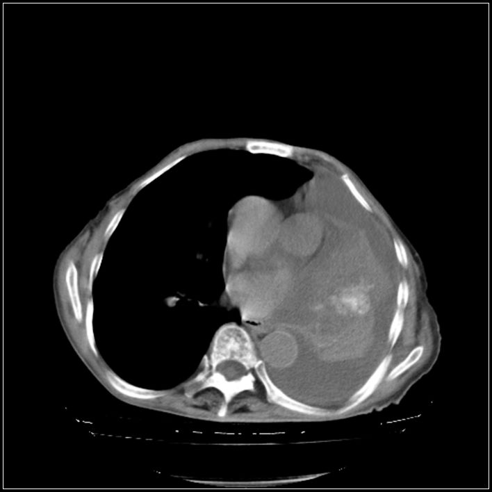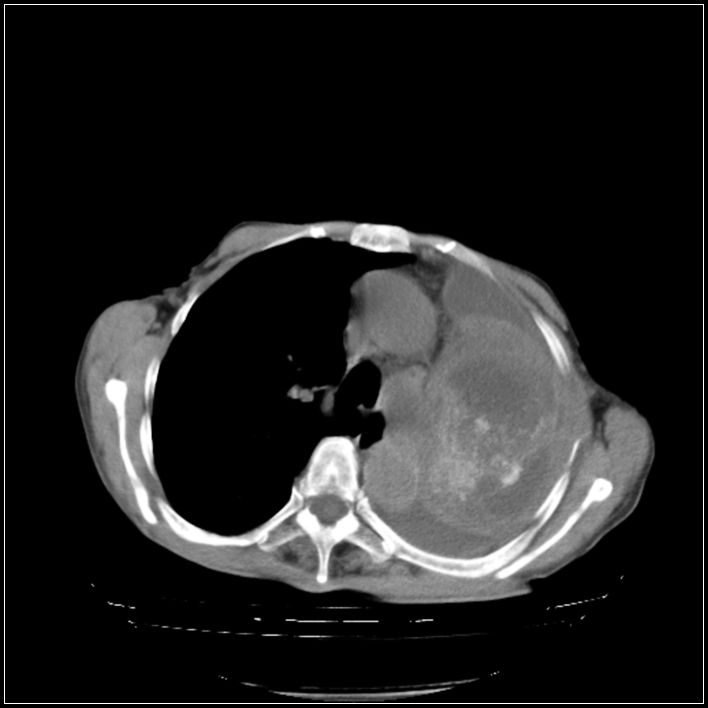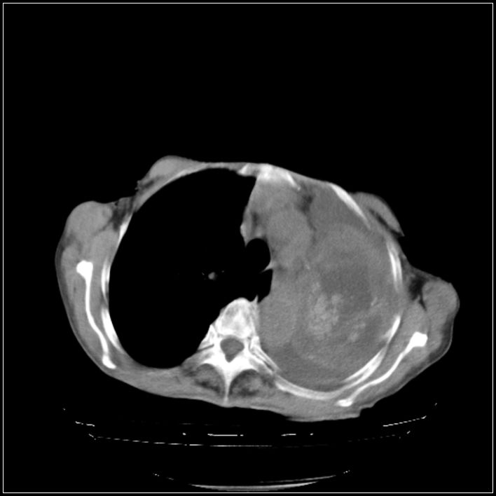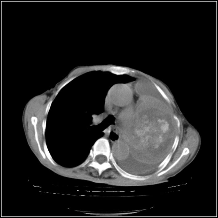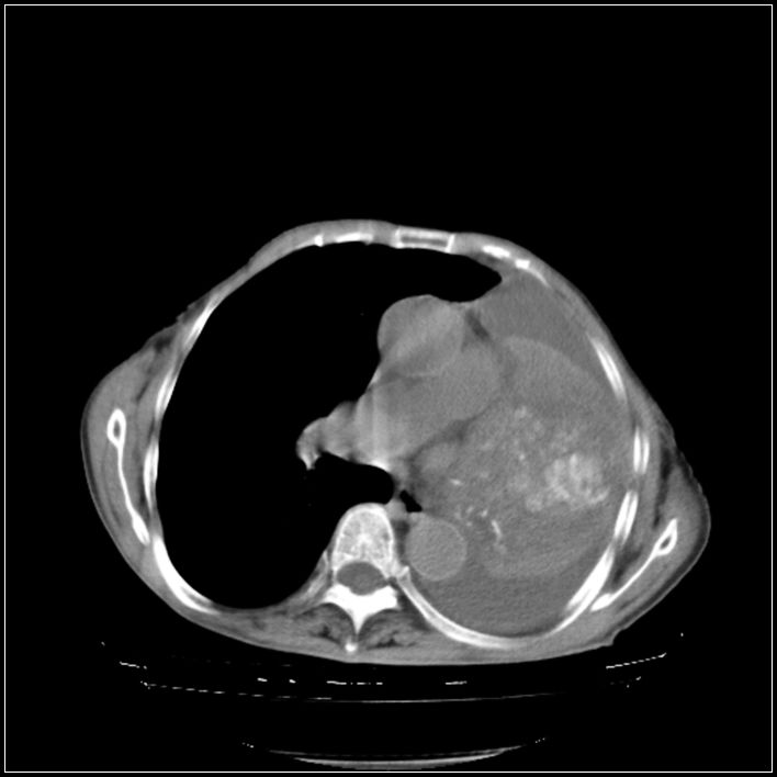 以下是引用影象小辈在2008-5-31 16:25:00的发言:[br]左侧胸腔团状不规则致密影,界欠规整,密度不均匀,其内可见更低密度影及高密度影,并可见包裹性胸腔积液 考虑为1.畸胎瘤 2.肺癌