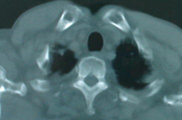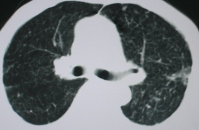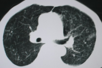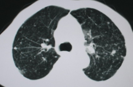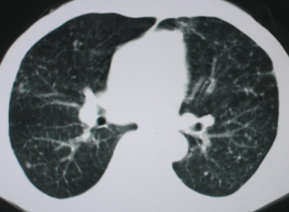 以下是引用卜一在2008-6-3 19:33:00的发言:[br]双肺结节,以双上肺分布为多,期间搀杂片状致密影及索条致密影。考虑:继发性肺结核伴血型播散可能性大。不除外肺泡ca的可能!另:椎体退变!