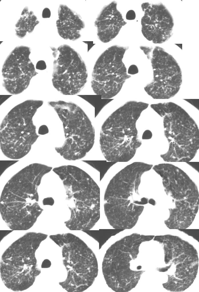以下是引用jinguoji在2008-6-3 20:20:00的发言:[br]双上肺弥漫性小结节影,纵隔窗内钙化淋巴结影,考虑血播性tb可能性较大,不除外肺ca可能。腰椎考虑退变。