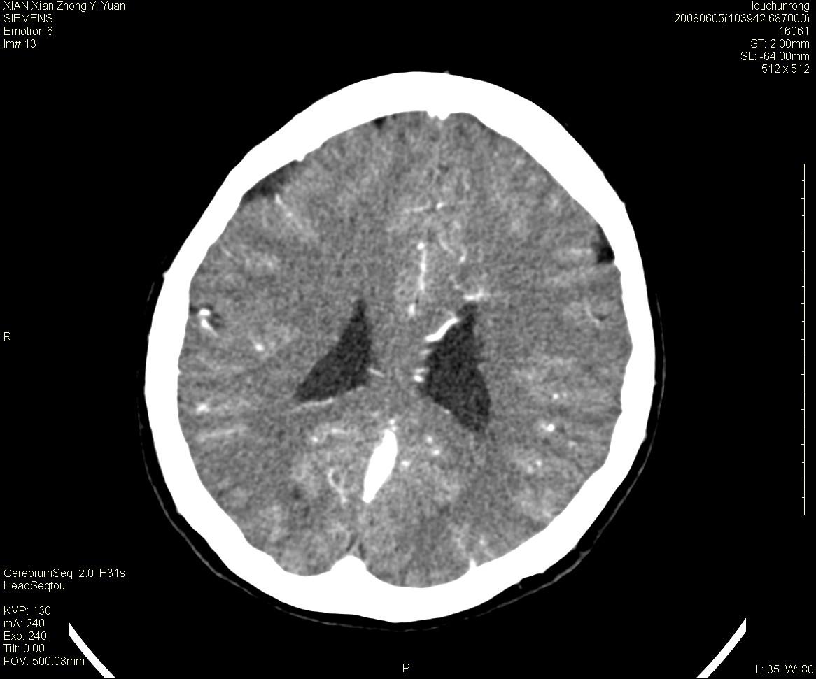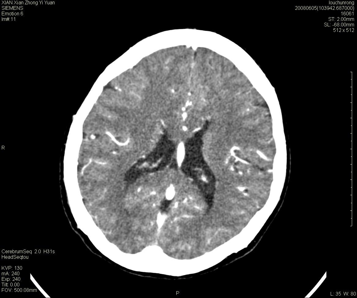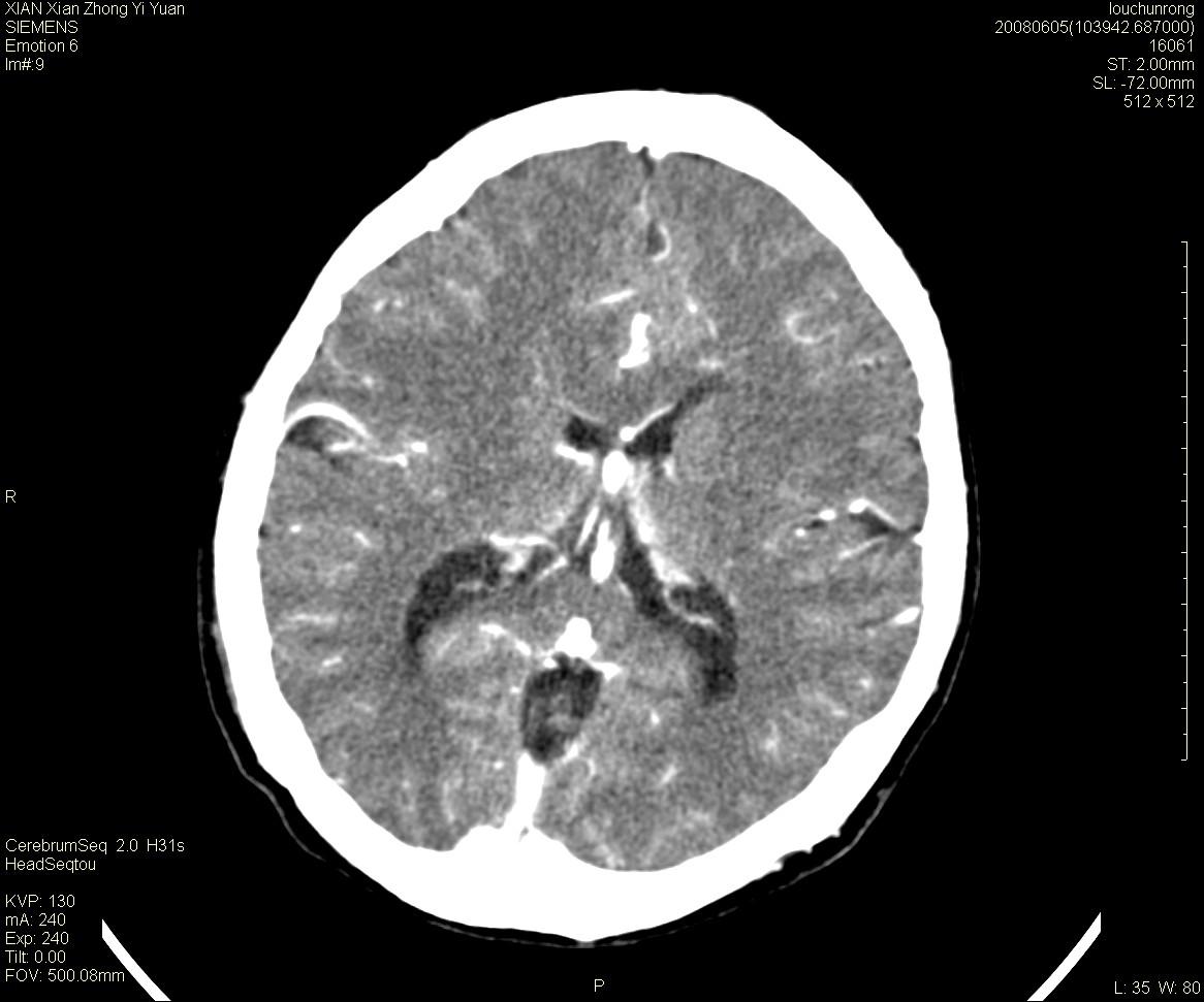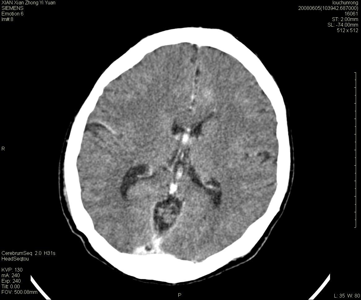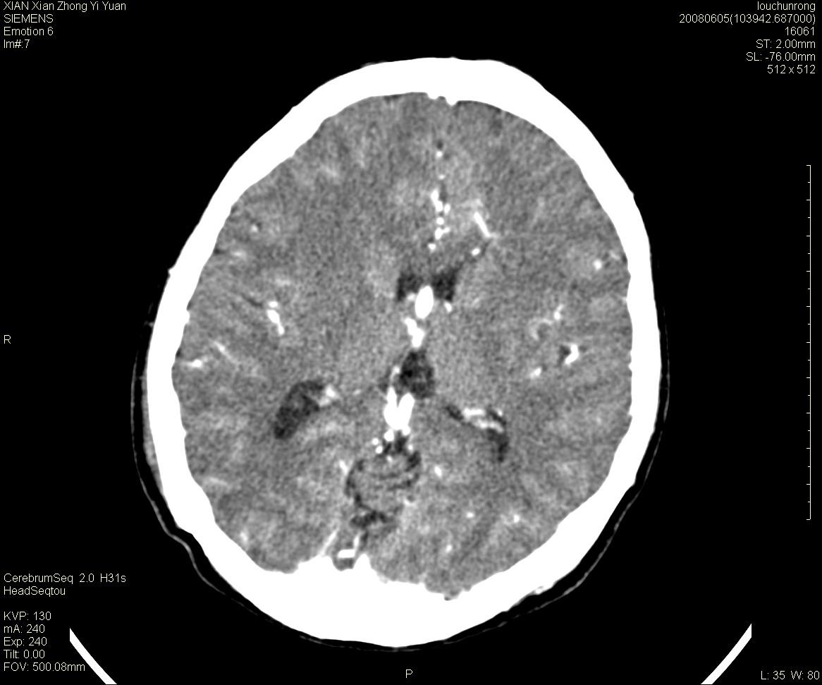 大脑大静脉池内的密度不均,双侧脑室增宽,我看右异常这块。战友们看看