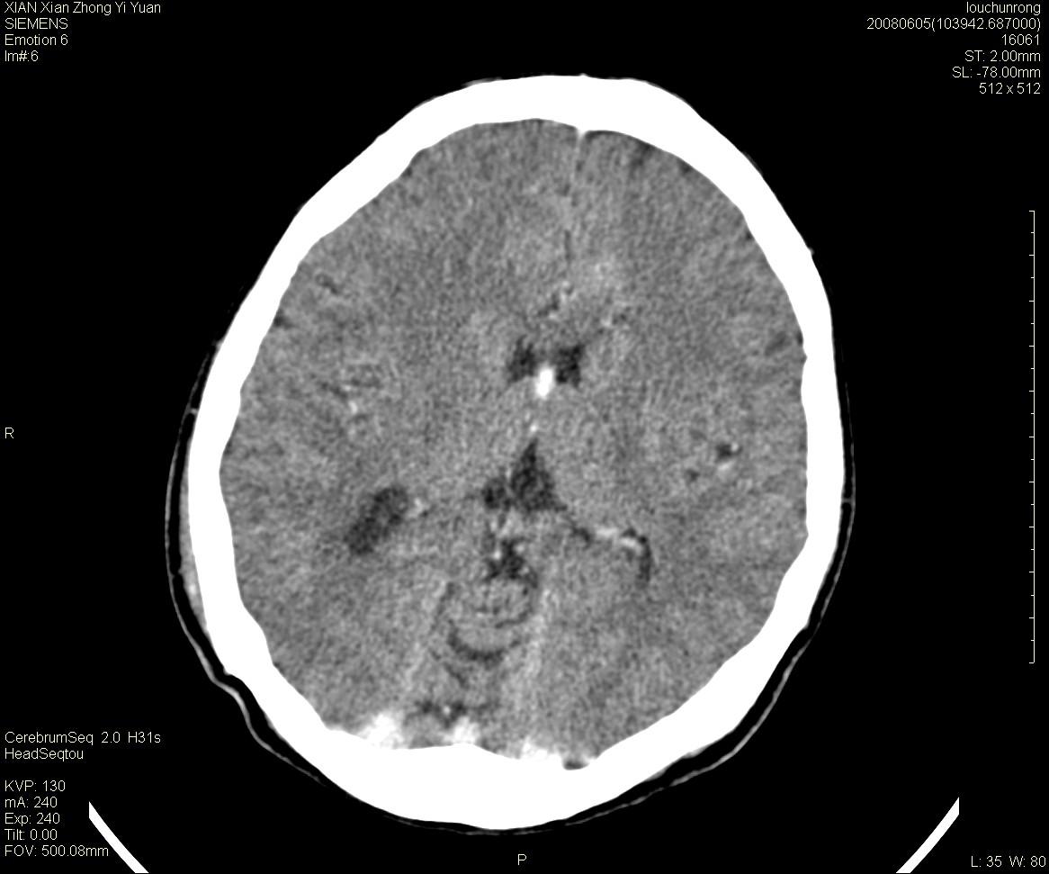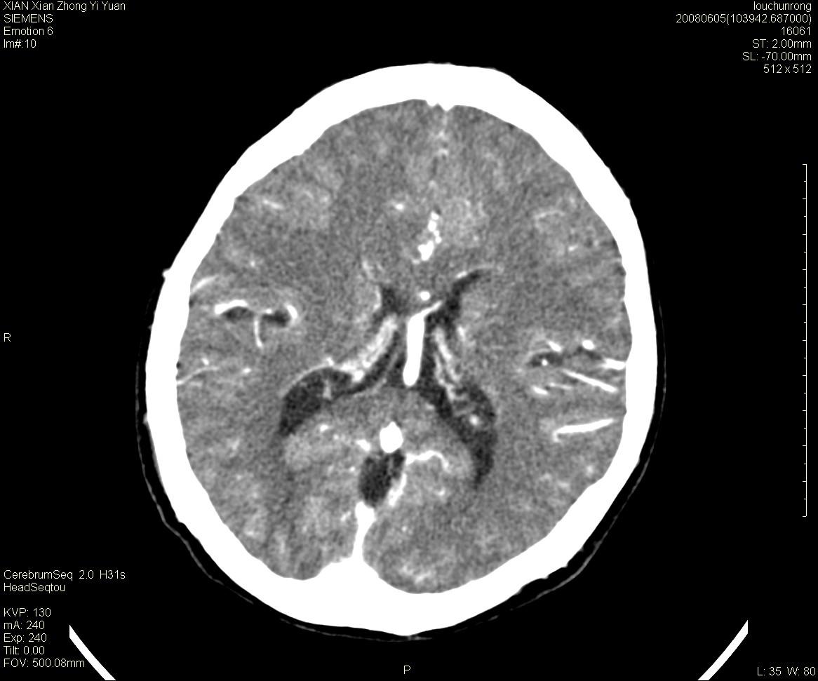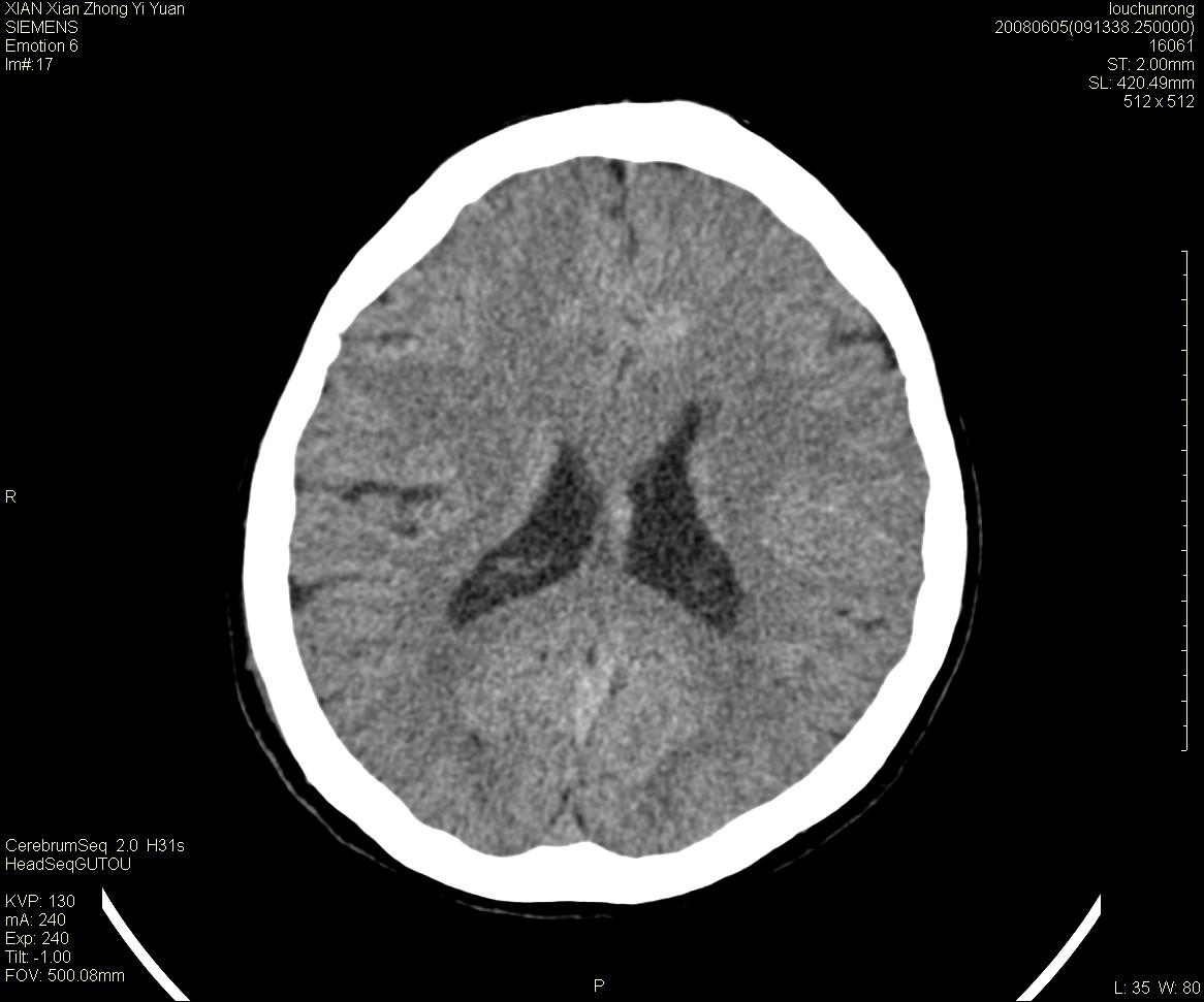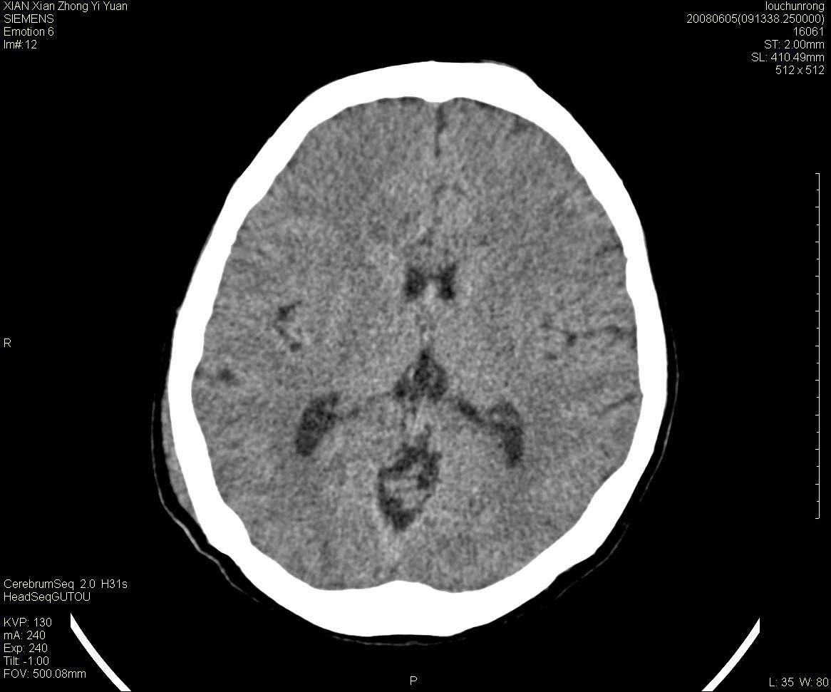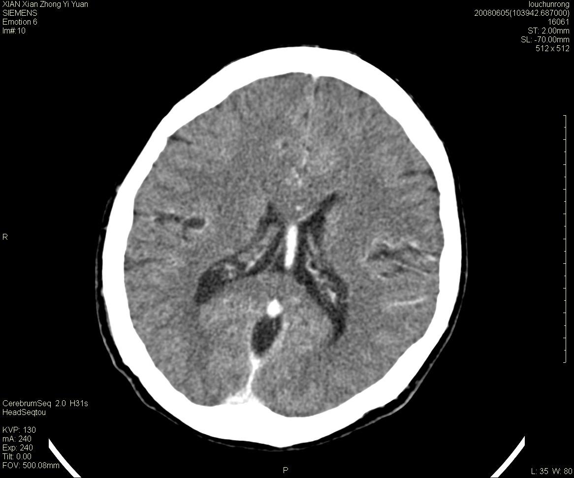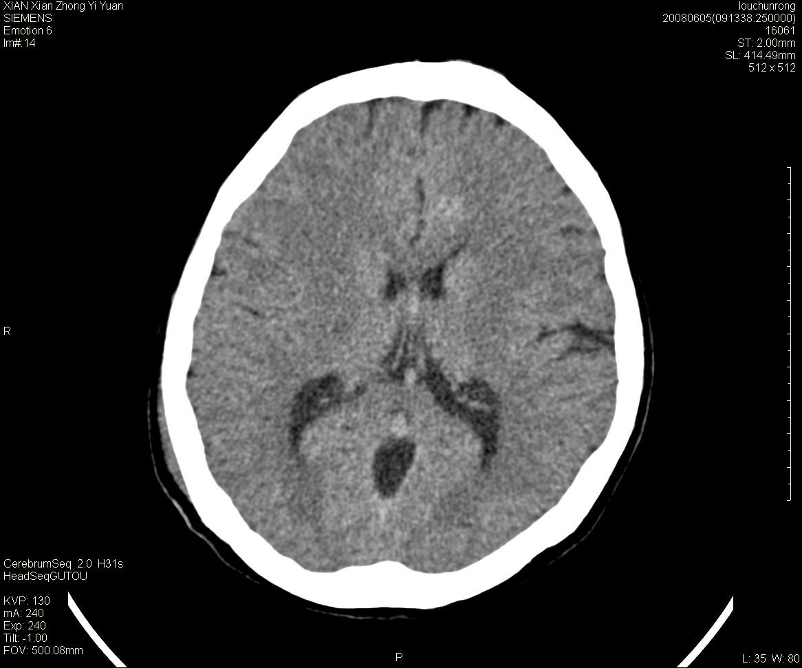 大脑大静脉池内的密度不均,双侧脑室增宽,我看右异常这块。战友们看看