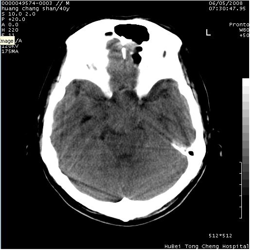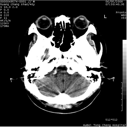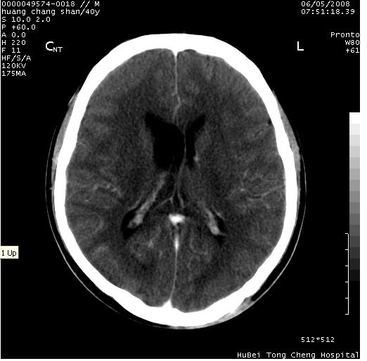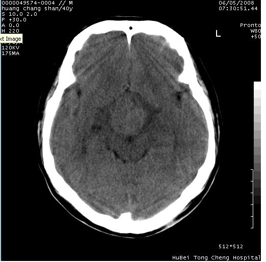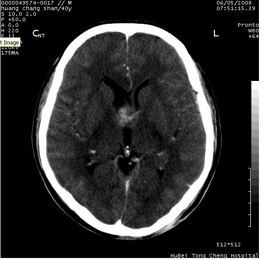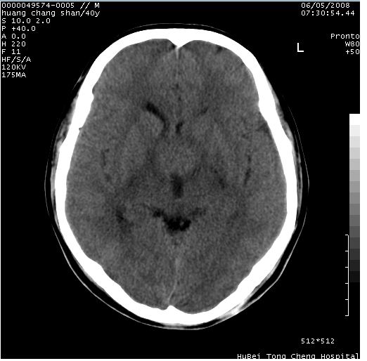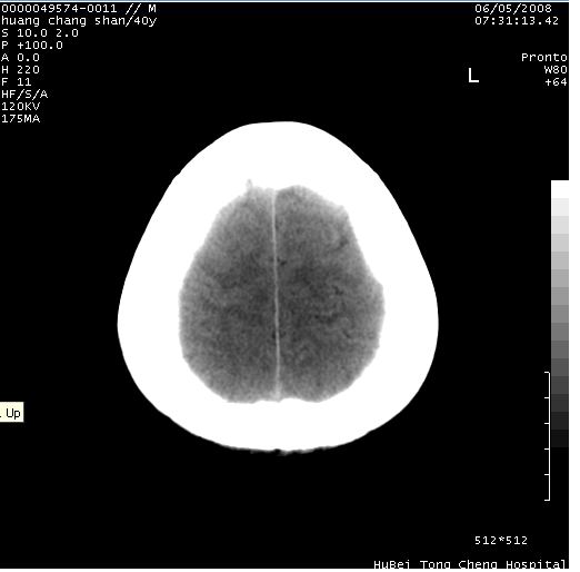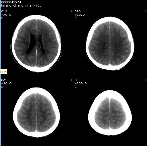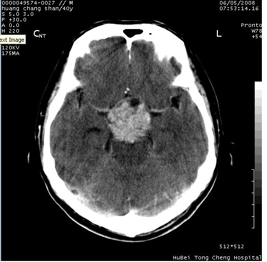 2、ct表现:肿瘤呈类圆形,均匀略高密度,无囊变,无钙化。侧脑室有扩大。