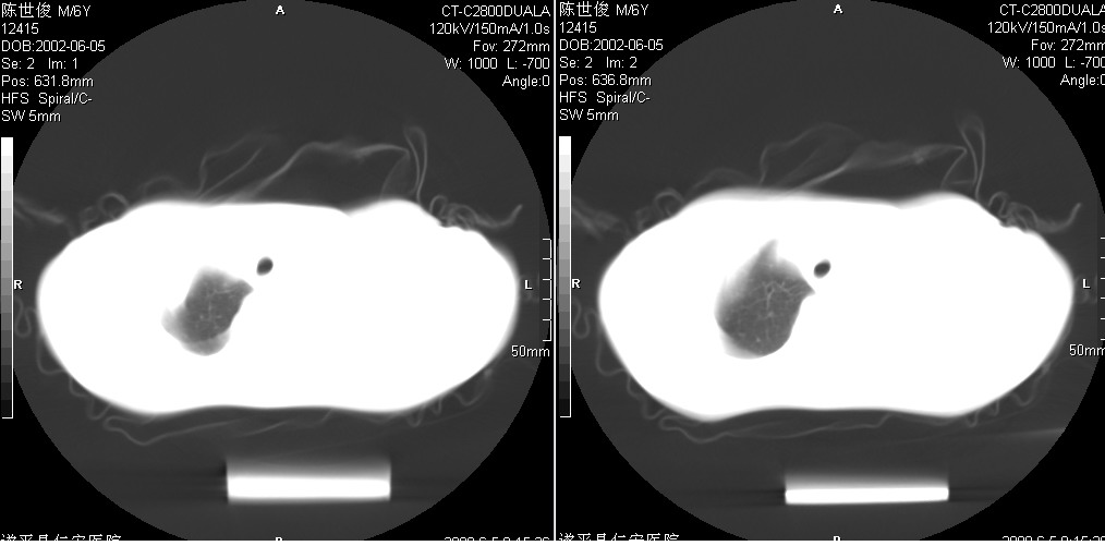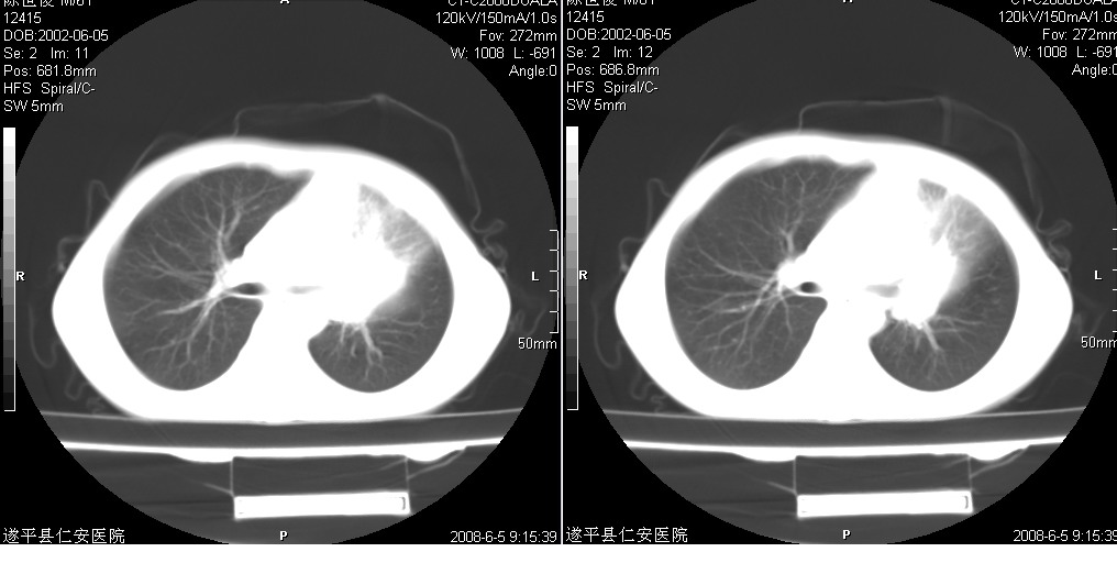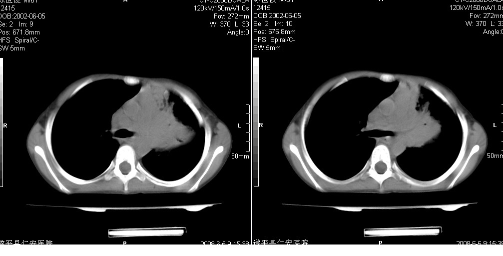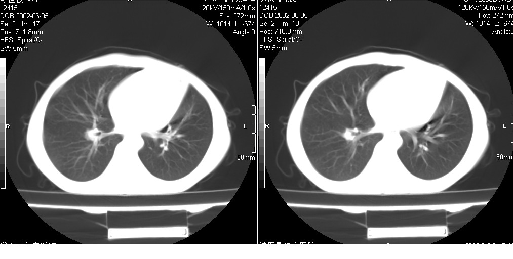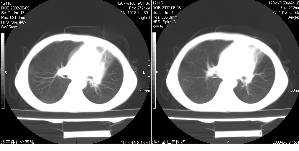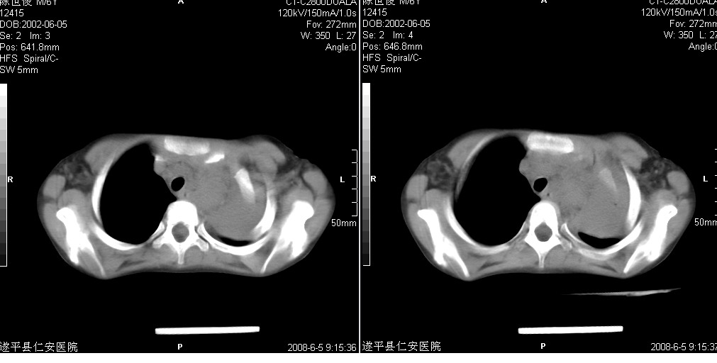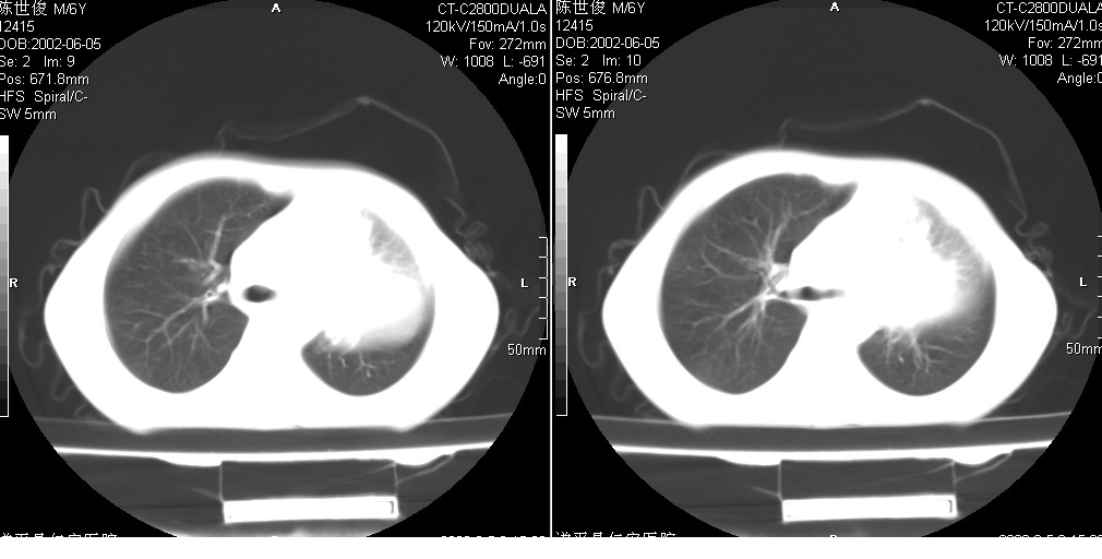以下是引用xxhwh在2008-6-10 18:40:00的发言:[br]男,6岁,无规则发热一月余,体温在37.8——39度之间。一月前拍胸片示左上肺密度增高影,进行抗炎治疗8天,复查胸片未明显吸收。又改变抗菌素继续治疗半月,照胸片示病灶吸收不明显,行ct检查[br]征象:左上肺前段呈密实影,内可见支气管气像,远侧见絮状模糊影,中上纵隔左移。[br]意见:左上肺前段膨胀不全及感染,考虑为支气管异物或支气管内膜结核所致,[br]建议追问有无异物吸入史,行痰检及ppd检查