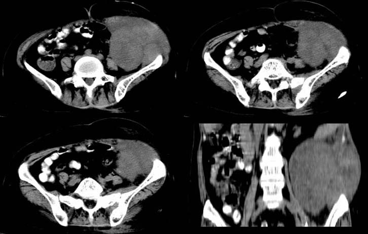 以下是引用qian在2008-6-12 20:27:00的发言:[br]肿块的最大直径位于左侧腹壁,肿块内的密度不均匀,与腹腔内的脏器的界限清楚,考虑为恶性病变,纤维肉瘤可能大。