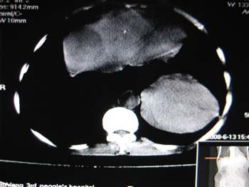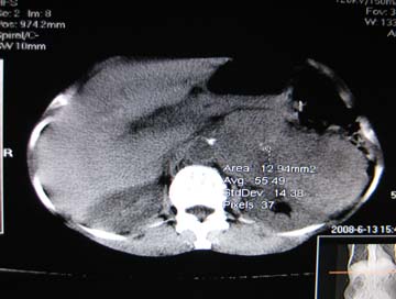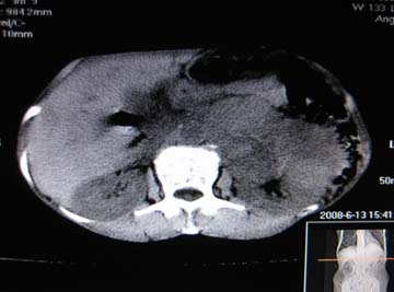 没有病史,没有强化,那就只有猜了,我看病灶很像肝、脾及腹腔多发脓肿,这只是我的意见,