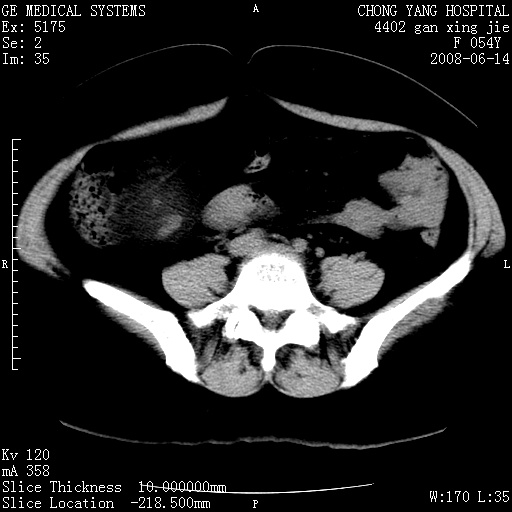 [br]1、脂肪肝。2、腹腔囊性占位,首考虑来源于右肾下极,其次考虑来源于肠系膜。