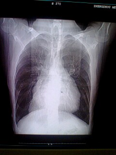以下是引用clj20在2008-6-16 21:51:00的发言:[br]一、建议完善病史,加摄左、右侧位及胸部透视。[br] 二、就片论片。[br] (一)两肺血正常,心影呈普大型,双房双室增大。[br] 1、如果考虑风心,不考虑三尖瓣狭窄,而考虑二狭二闭。[br] 2、无病史,先心,心肌病等都有可能。[br] (二)右心膈角区阴影正位观[br] 1、纵隔占位:心包囊肿可能。[br] 2、下腔静脉,心包脂肪垫可能。[br]