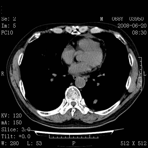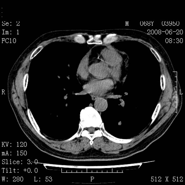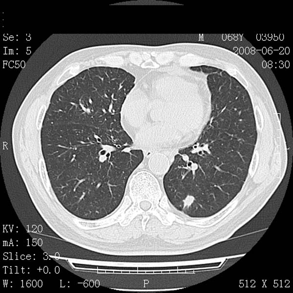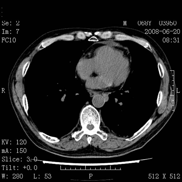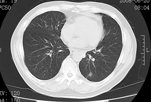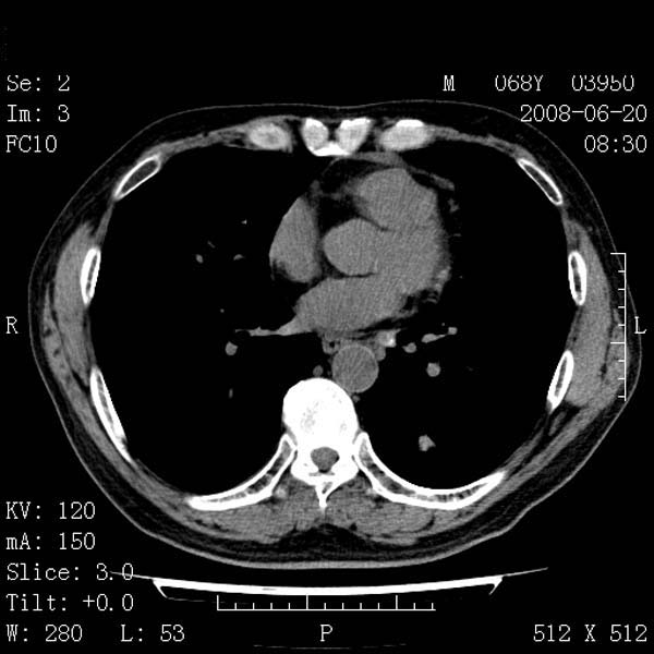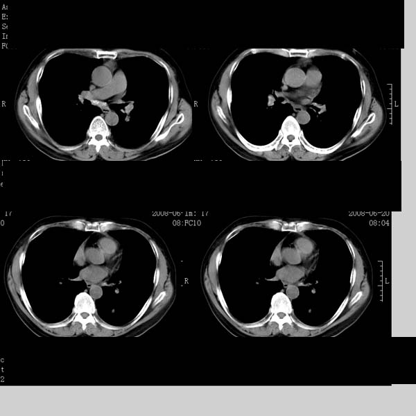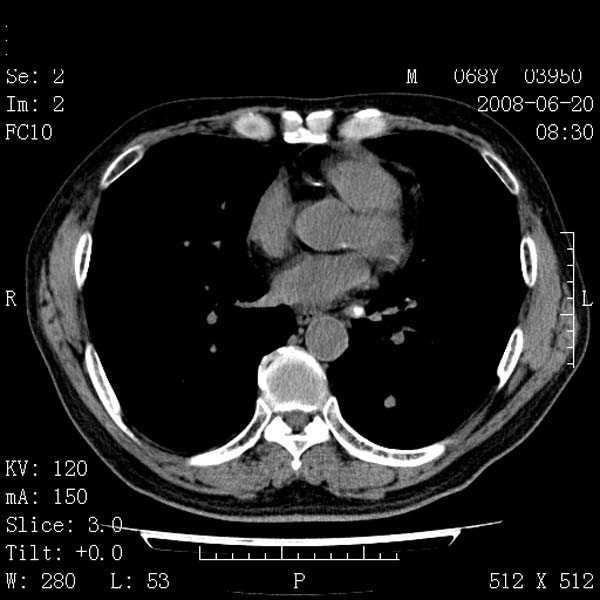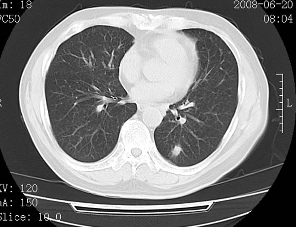以下是引用zhangling在2008-6-24 14:56:00的发言:[br]我们科室意见报告为[br][br]1考虑左下肺周围型肺癌[br]2右肺小结节考虑转移瘤,纵隔淋巴结转移[br]3心包积液. [br] 各位老师分析的相当好 谢意[br]