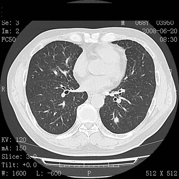 以下是引用守望可可西里在2008-6-24 1:11:00的发言:[br][br] 考虑为周围型肺癌:[br] 1.分叶结节,形态极不规则,蟹足样伸展的恶性浸润特征比较明确。[br] 2.磨玻璃影中由多个更高密度小结节聚集呈梅花瓣样。[br] 3.局部胸膜凹陷征比较明确。[br][br] 另:纵隔胸膜明显增厚、粘连。