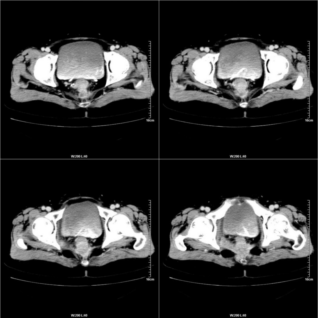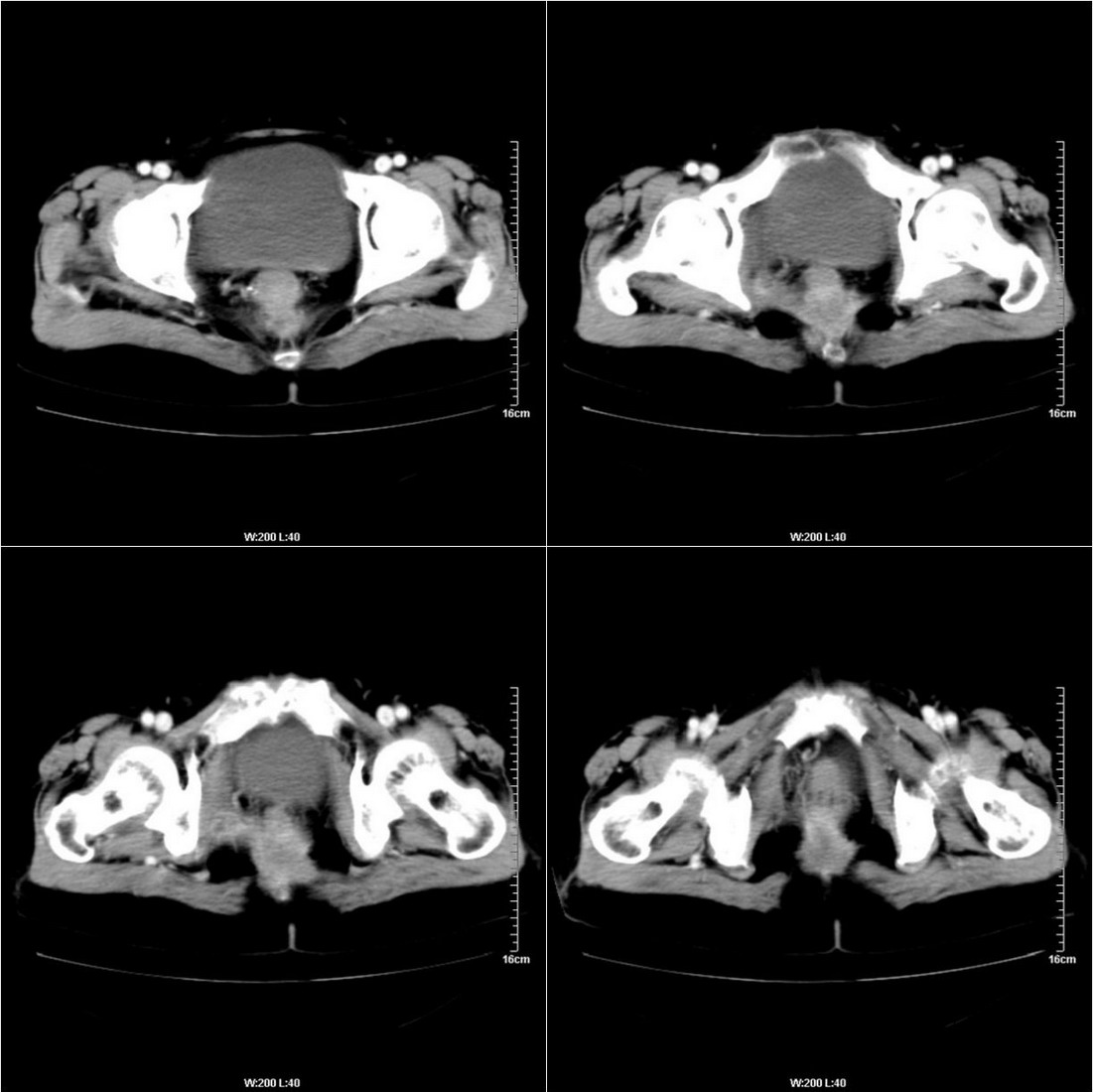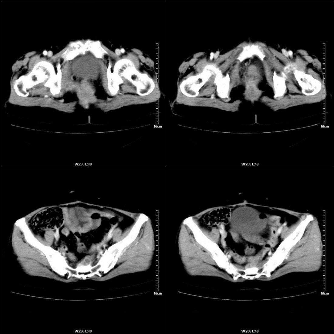 不知道病人的直肠癌手术方式如何,直肠已经全部切除,乙状结肠造瘘于左下腹,肛门应该也没有保留吧?如此,应该是复发了: