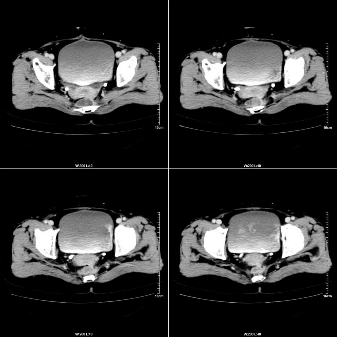 膀胱壁见索条状软组织密度影伴强化,可考虑炎性肉芽肿样增生改变,常见于放疗后或慢性感染;直肠及周围软组织见肿块,轻度强化,考虑直肠癌术后复发,并侵犯周围组织