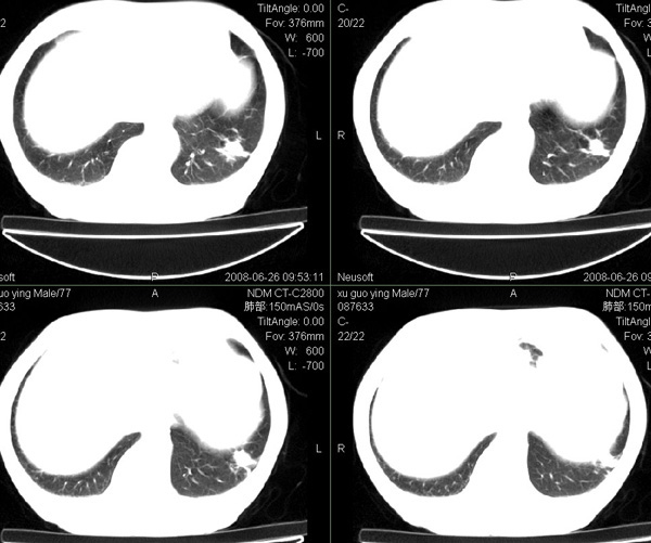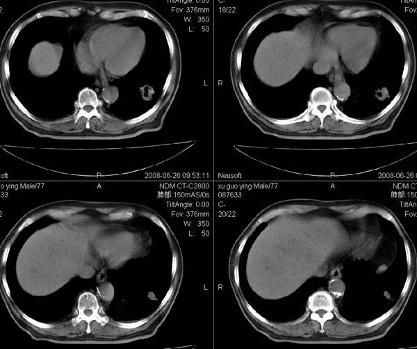 以下是引用狙击手在2008-6-26 20:16:00的发言:[br]上腹部除了胆囊大一点,其余未见明显异常,肺尖部见纤维条索样影,左肺下叶见空洞样占位,壁较厚,临近胸膜见牵拉,周围未见卫星灶,考虑:1:左下肺周围性肺癌;2:肺尖部陈旧性结合灶。