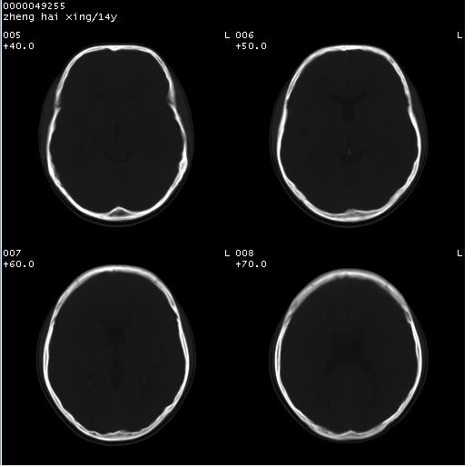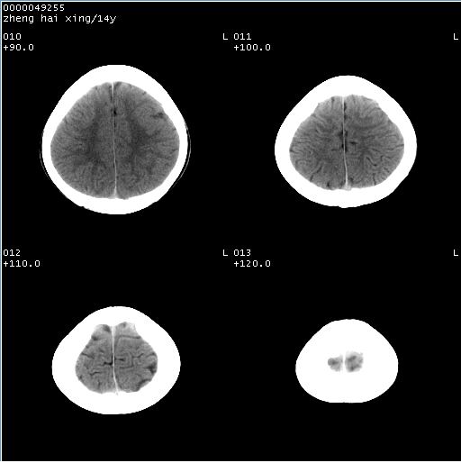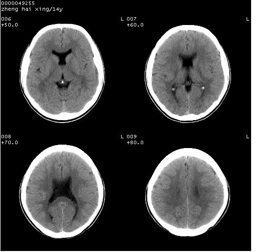 颅脑ct轴位平扫(层厚、层距均为10mm),图像如下: