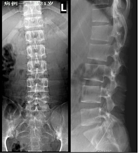男性患者,21岁,轻微腰背痛.双侧骶髂关节下缘破坏,腰椎曲度变直,骨质疏松,腰2-5椎体为方形,但尚未出现典型的竹节样改变。在北京阜外医院全面检查,诊断为强直性脊椎炎.