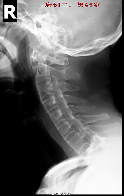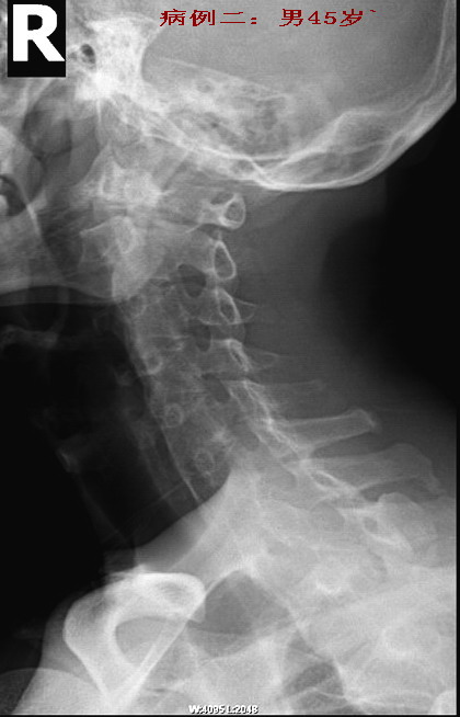 男性45岁,患者已有明显的颈部强直症状。从骶髂关节上行至颈椎均呈典型改变(腰椎侧位片已遗失.没有也无所谓)。