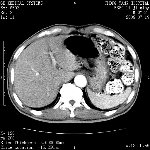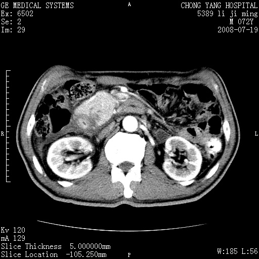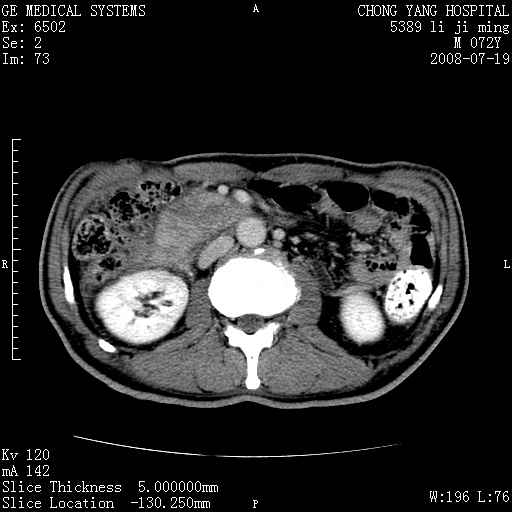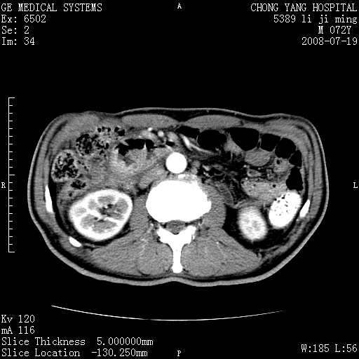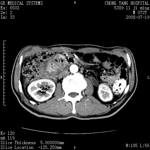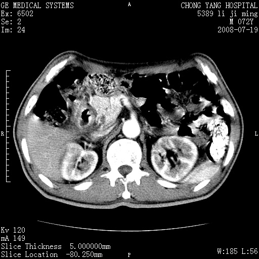 以下是引用zjzjr在2008-7-19 20:57:00的发言:[br]胰头增大,边缘模糊,周围可见渗出影,右侧肾前筋膜增厚.支持胰腺炎.