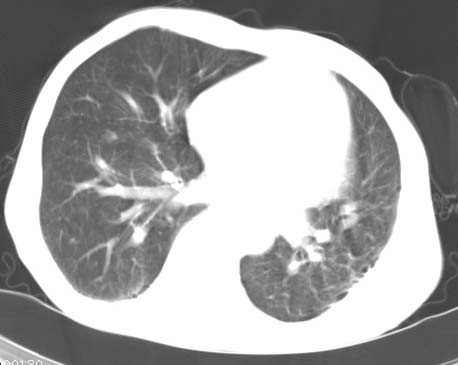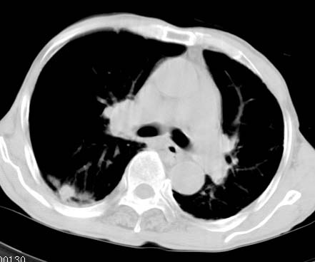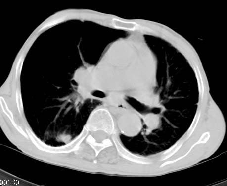 标题: CT14816:男性81岁 胸痛 咳嗽2月 2周前提示右下肺感染.