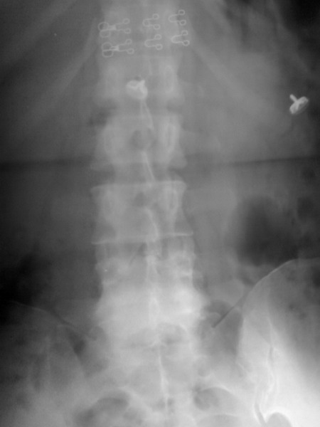 以下是引用zhangzhongshou在2008-7-31 22:22:00的发言:[br]腰4双侧椎弓峡部崩裂,ii度前滑脱,继发性椎管狭窄。伴腰4-5椎间盘退行性变。