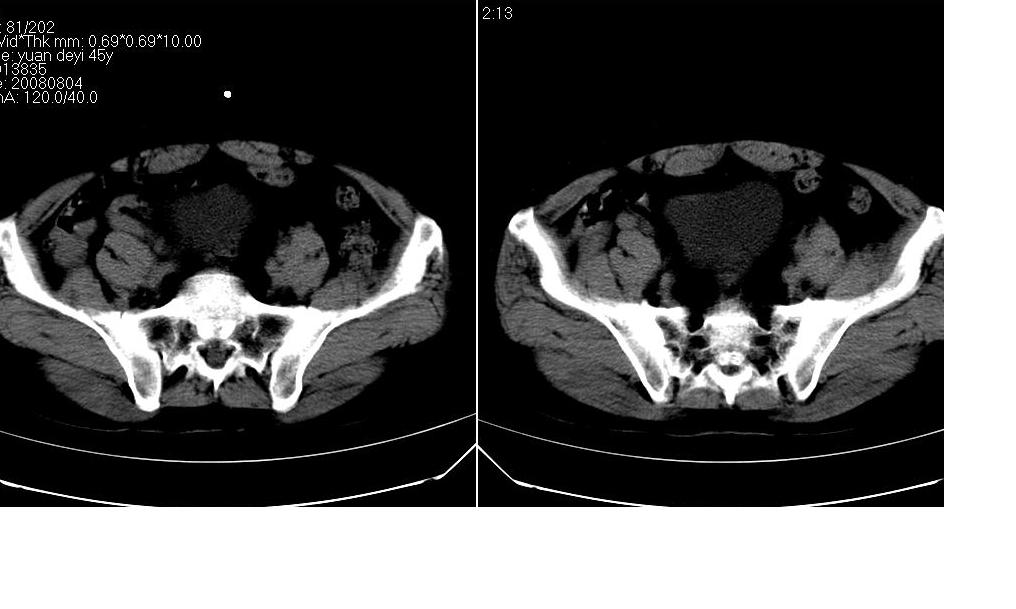 男 45岁,05年在外医院行膀胱癌手术,近期发现腹壁包块.