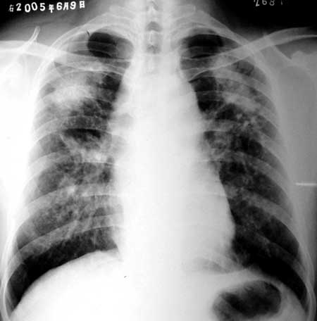 患者,男,46岁,咳嗽10多天。其他病史不详.双上肺见较对称的长片团影,右侧较左侧大。另外双肺似可见小点结增密影显示,可见气肿征,心影示相对狭小。考虑尘肺[警惕伴发肺结核可能或炎症]