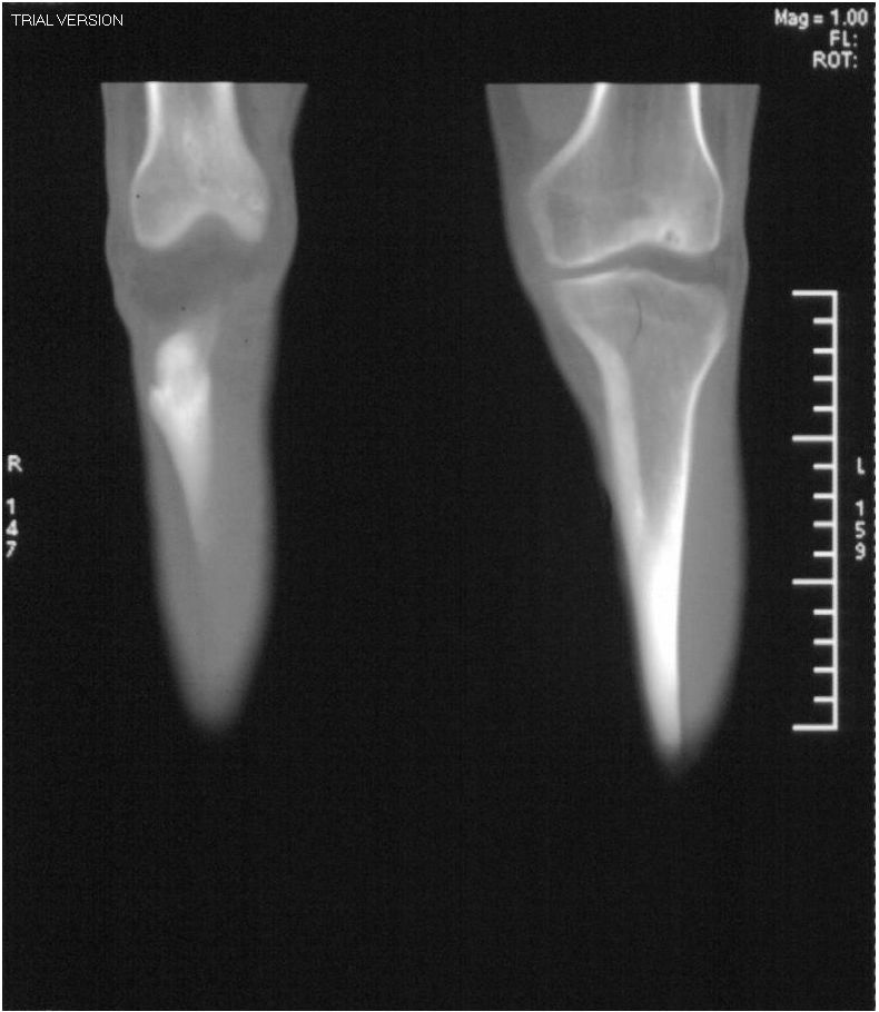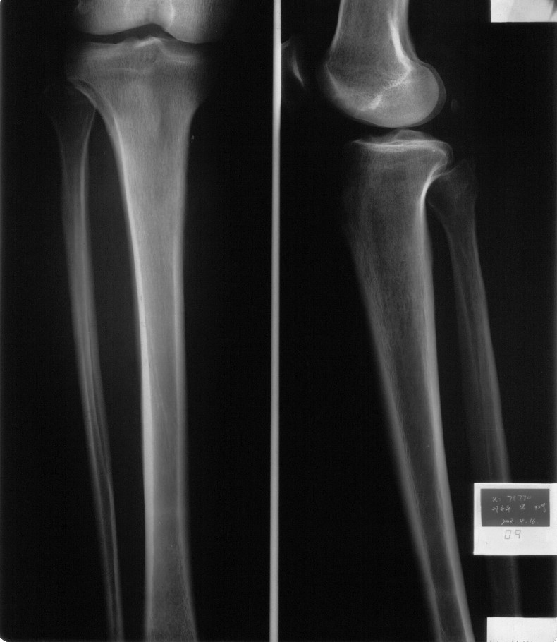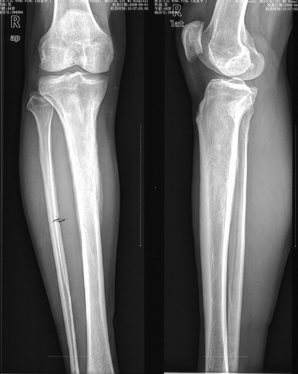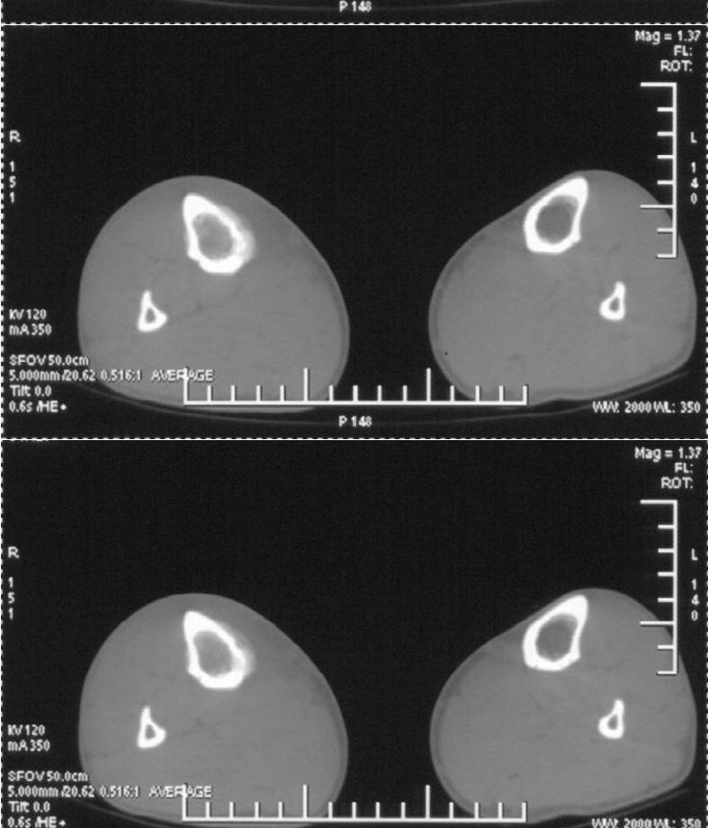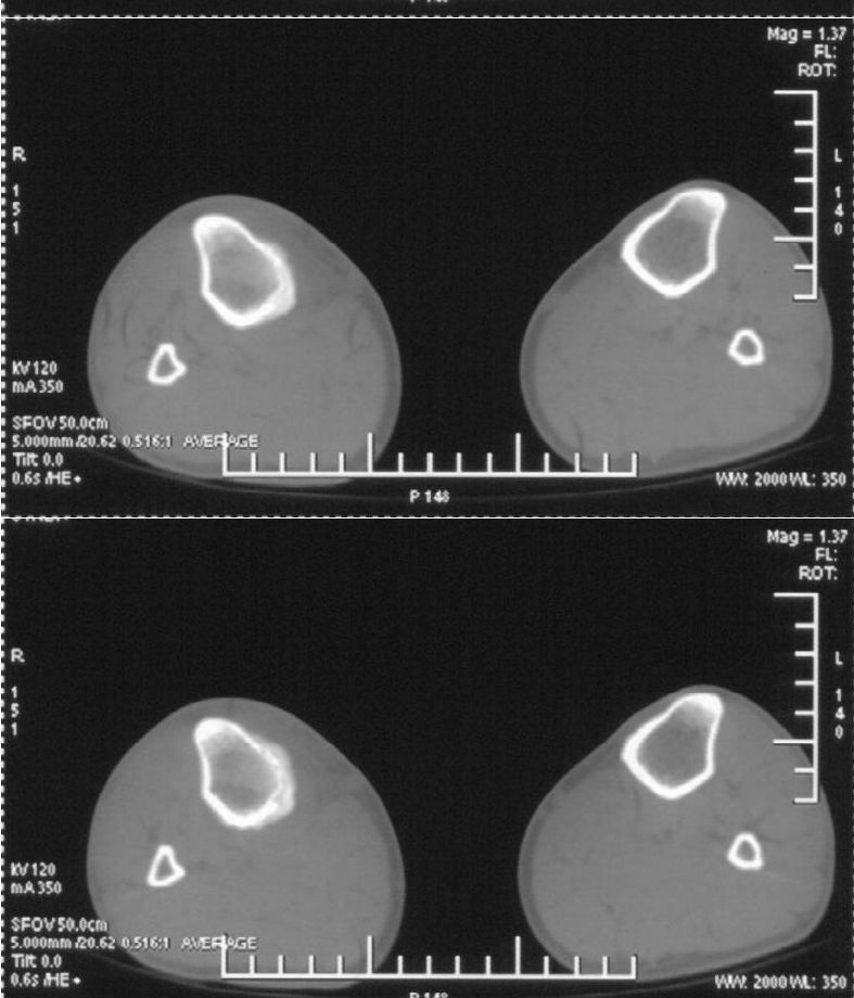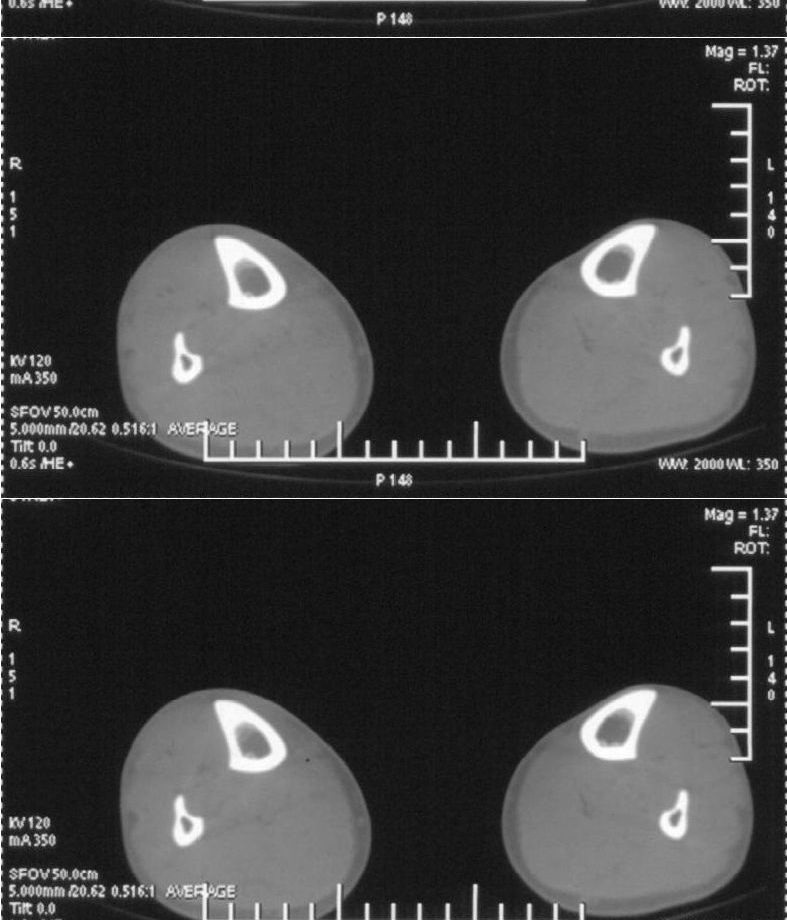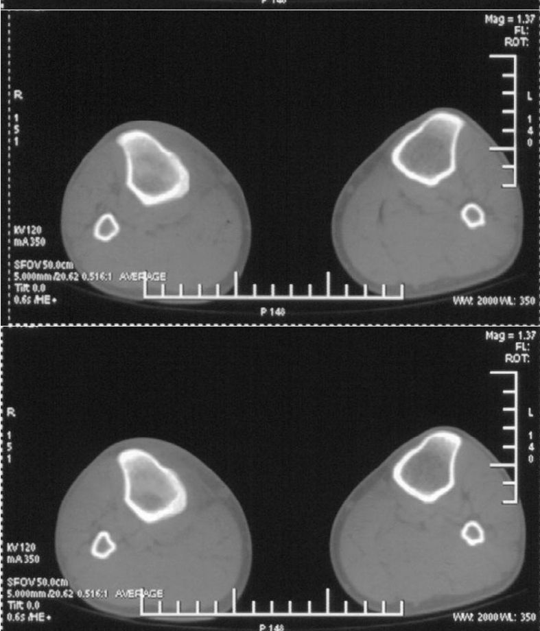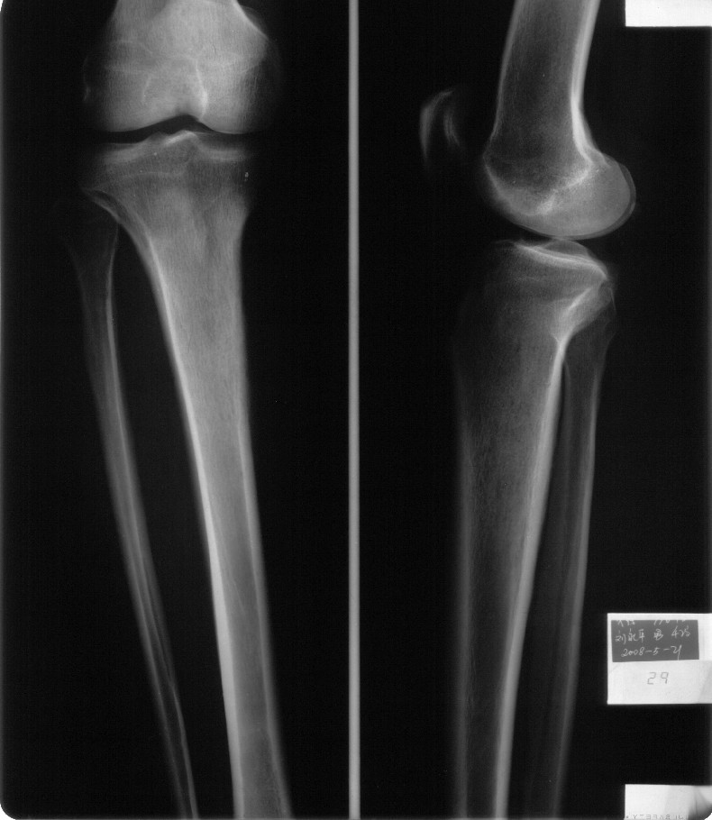 男,42岁。4个月前钢筋钝伤右侧小腿部,当时因无明显外伤,未引起重视。一周后因受伤腿部疼痛,发现肿胀,随后到当地医院进行检查(2008年4月16日)。因未发现骨质异常未引起重视,仅仅进行口服抗生素治疗处理。经过一段时间治疗但未见明显治疗效果在5月29日又进行x线检查,发现有胫骨密度上段密度增高,又进行抗炎治疗,仍未见效果。又在7月3日进行x线检查,仍然报告有胫骨上端密度增高,并建议ct检查。以下是相关检查结果:
