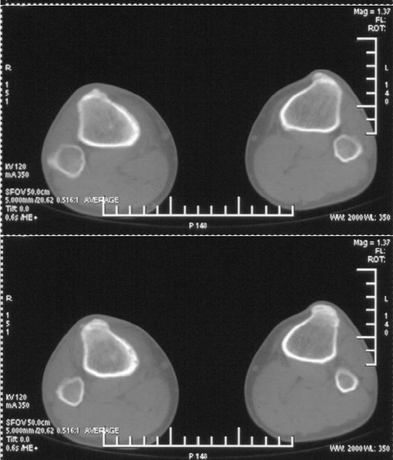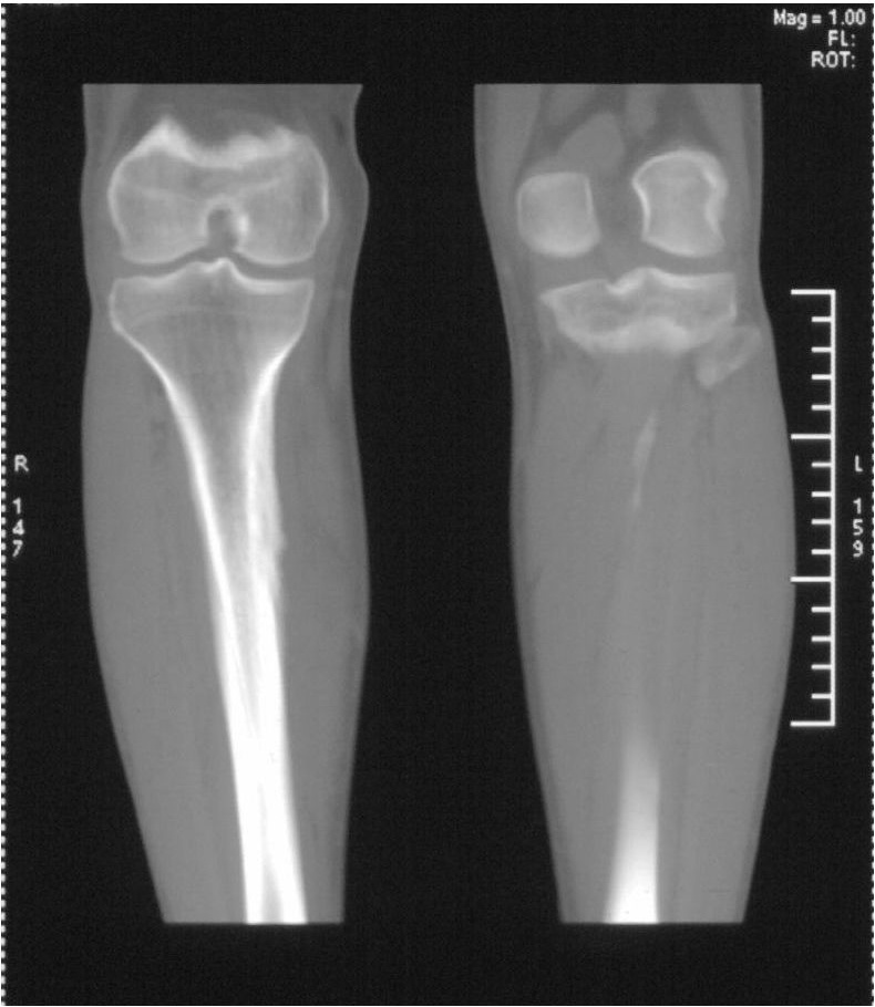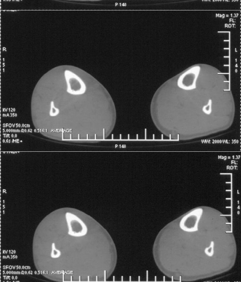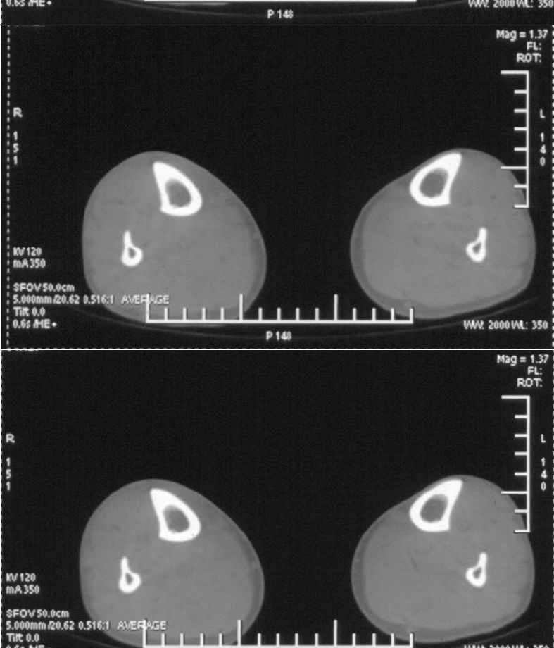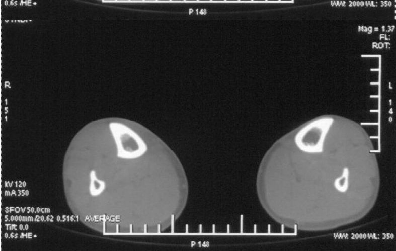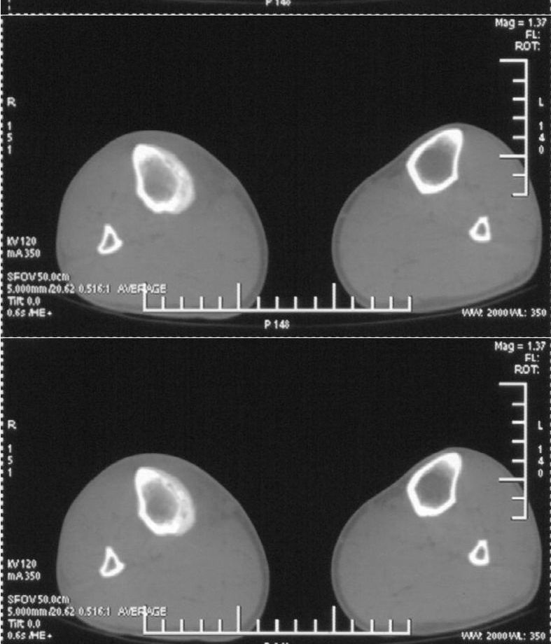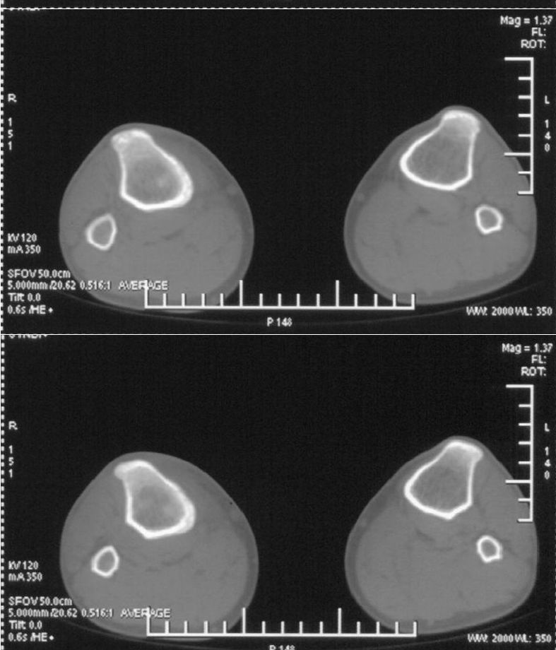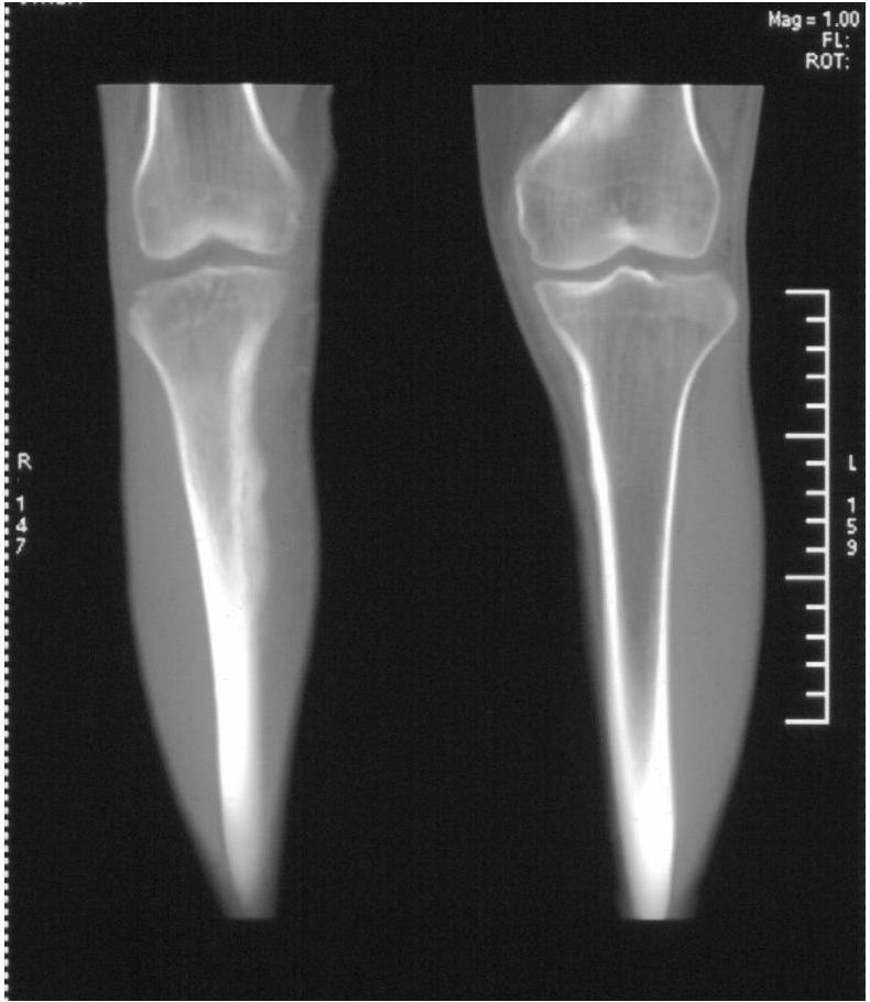 男,42岁。4个月前钢筋钝伤右侧小腿部,当时因无明显外伤,未引起重视。一周后因受伤腿部疼痛,发现肿胀,随后到当地医院进行检查(2008年4月16日)。因未发现骨质异常未引起重视,仅仅进行口服抗生素治疗处理。经过一段时间治疗但未见明显治疗效果在5月29日又进行x线检查,发现有胫骨密度上段密度增高,又进行抗炎治疗,仍未见效果。又在7月3日进行x线检查,仍然报告有胫骨上端密度增高,并建议ct检查。以下是相关检查结果: