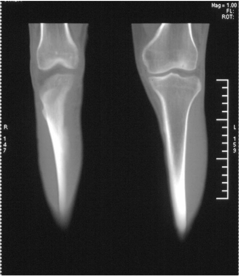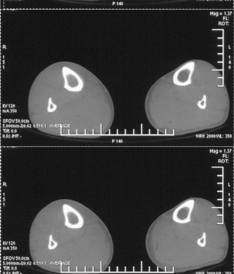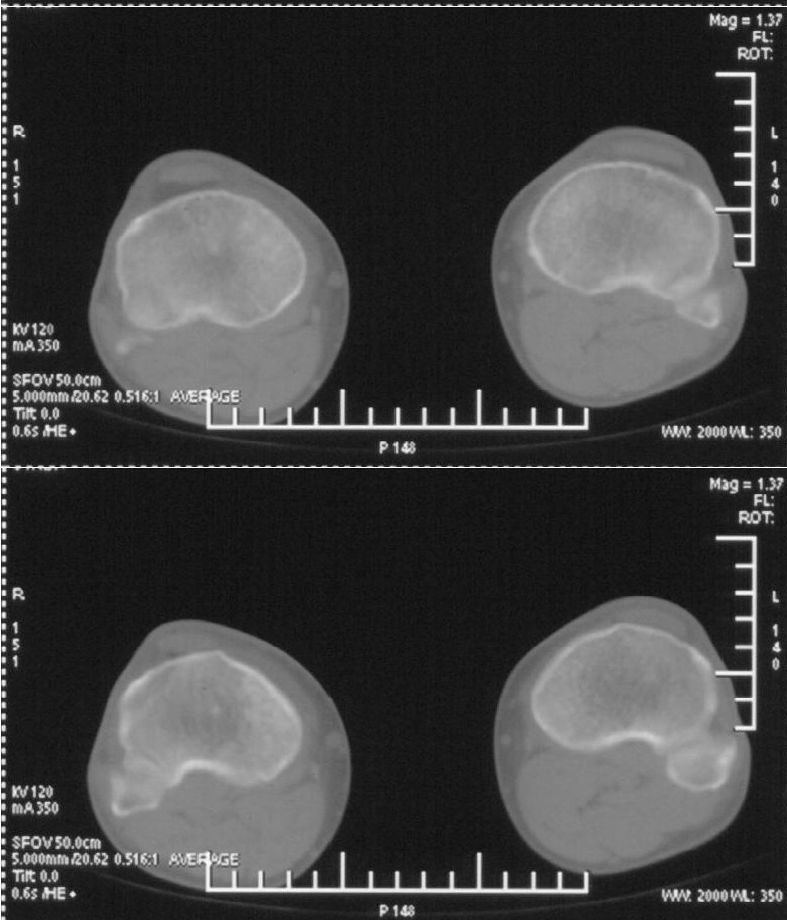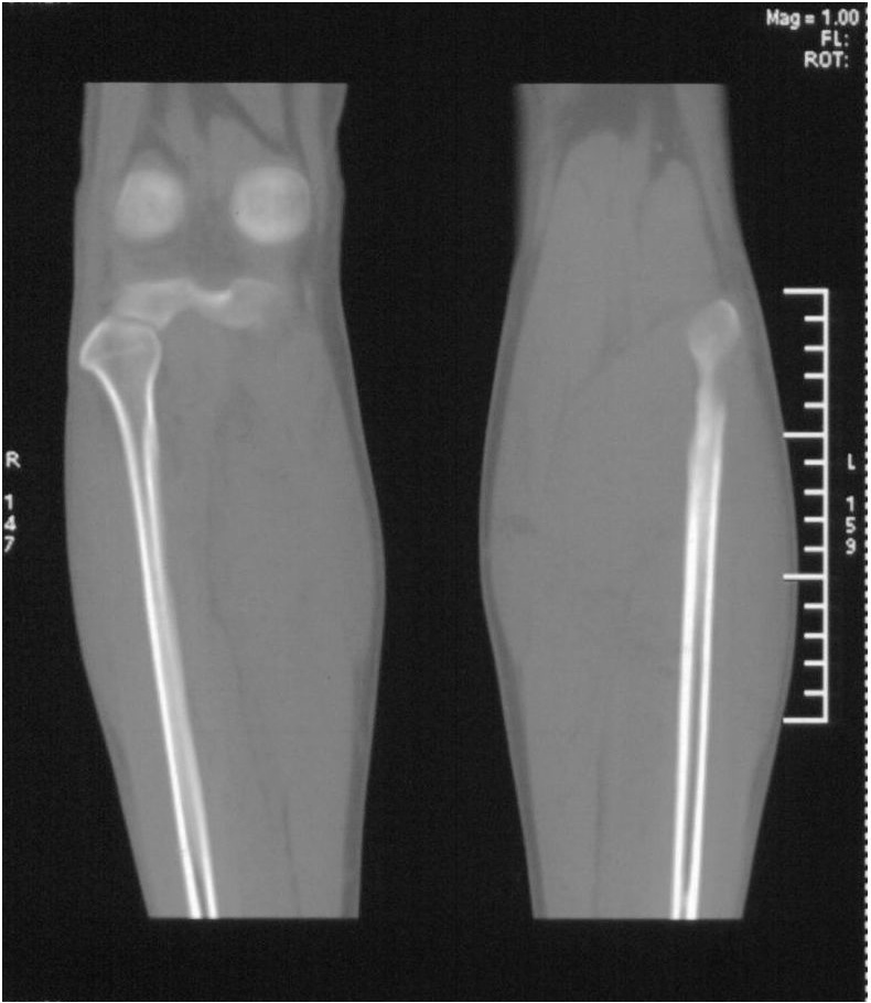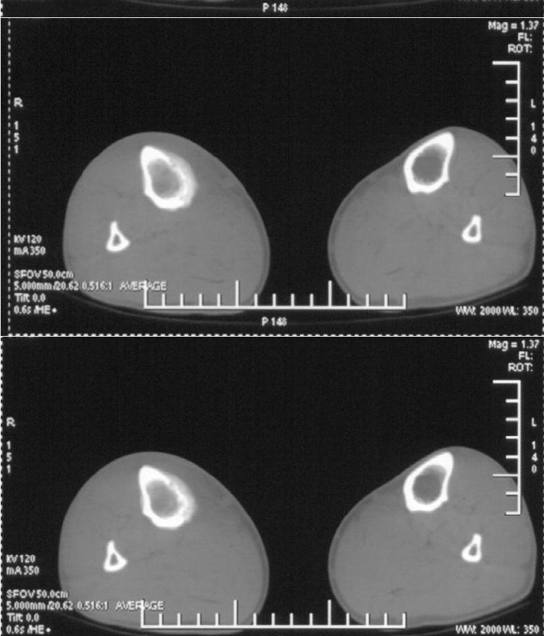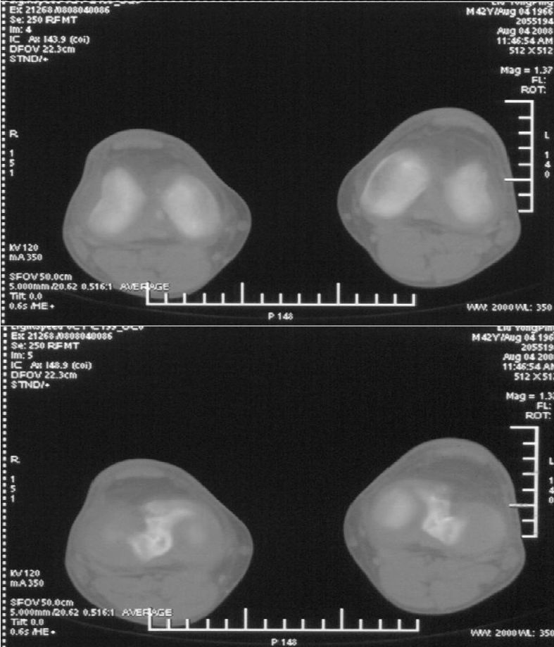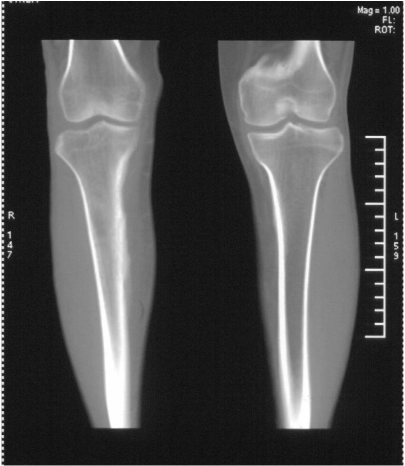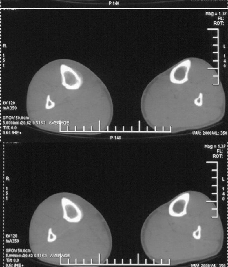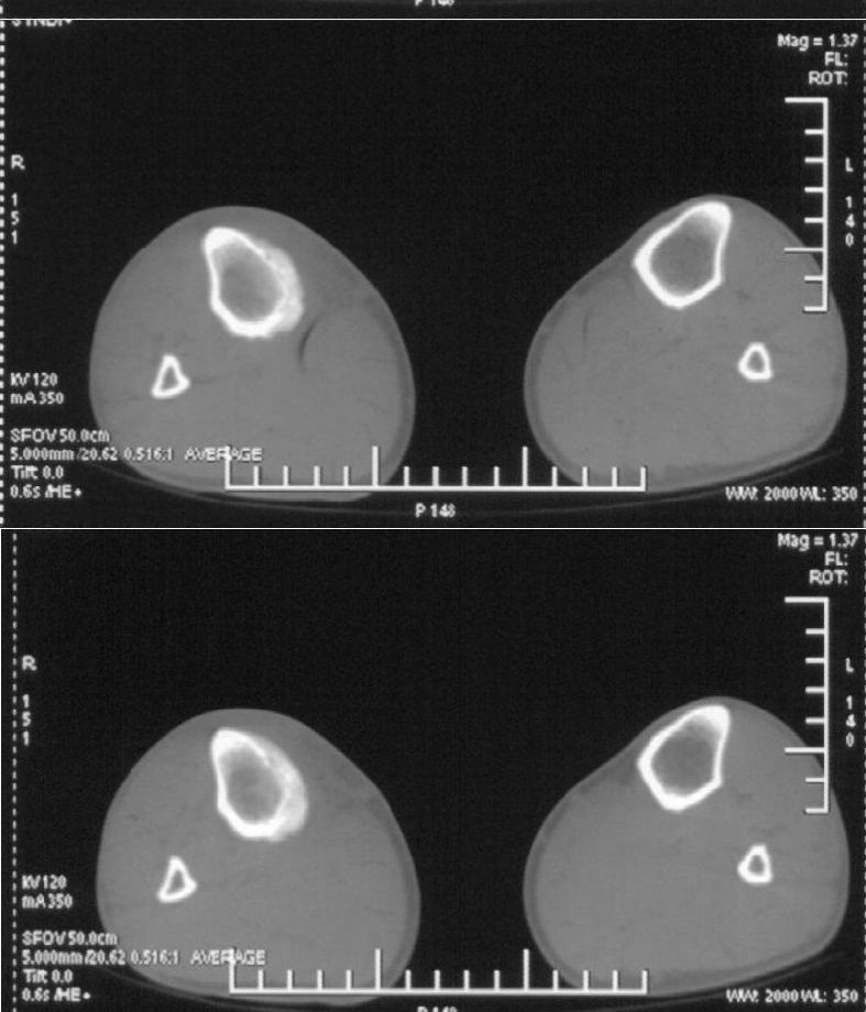 男,42岁。4个月前钢筋钝伤右侧小腿部,当时因无明显外伤,未引起重视。一周后因受伤腿部疼痛,发现肿胀,随后到当地医院进行检查(2008年4月16日)。因未发现骨质异常未引起重视,仅仅进行口服抗生素治疗处理。经过一段时间治疗但未见明显治疗效果在5月29日又进行x线检查,发现有胫骨密度上段密度增高,又进行抗炎治疗,仍未见效果。又在7月3日进行x线检查,仍然报告有胫骨上端密度增高,并建议ct检查。以下是相关检查结果: