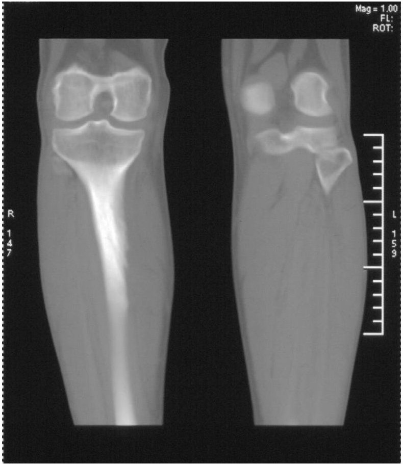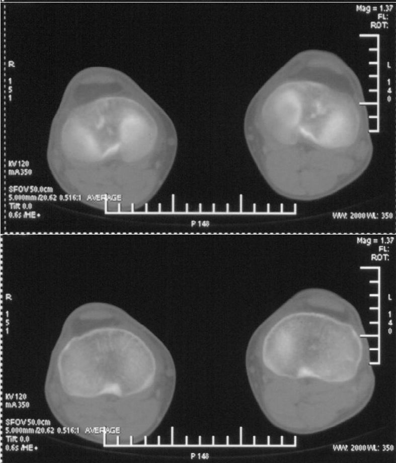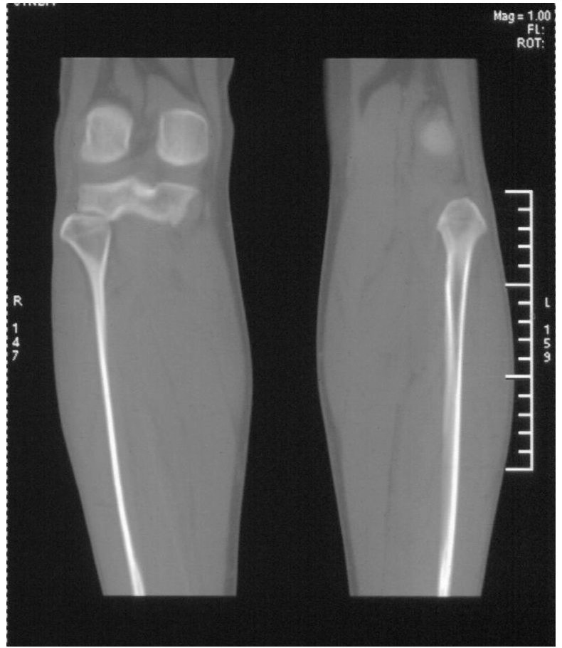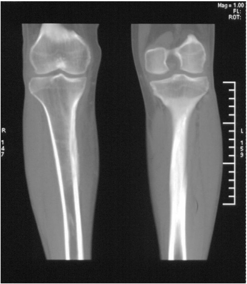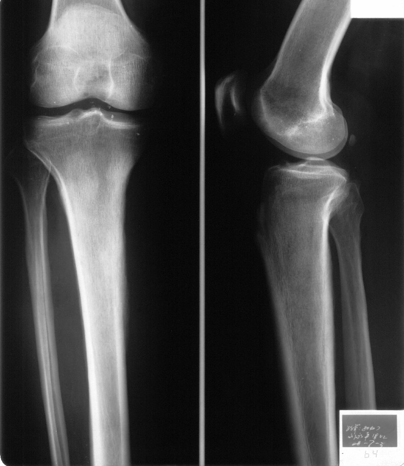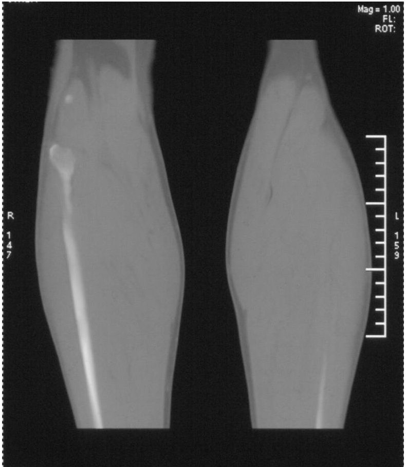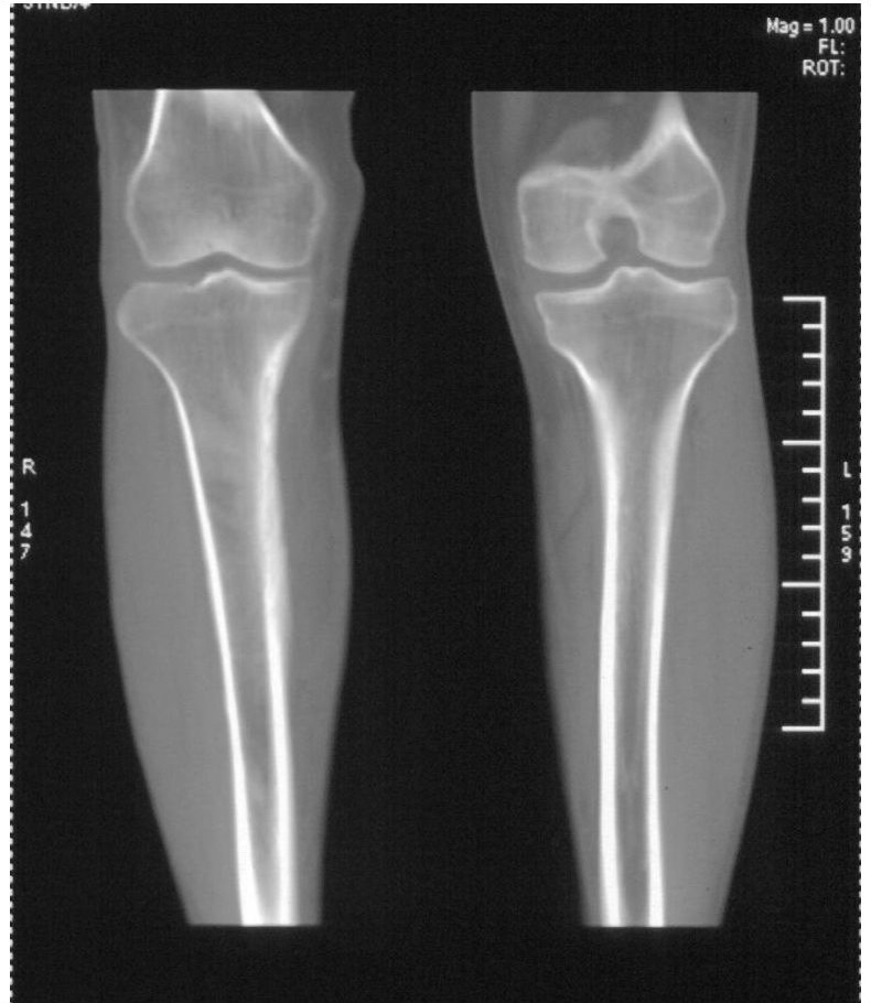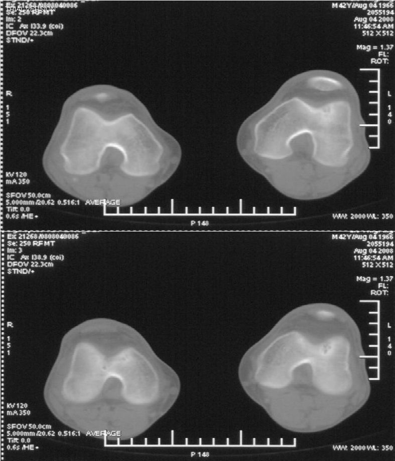 男,42岁。4个月前钢筋钝伤右侧小腿部,当时因无明显外伤,未引起重视。一周后因受伤腿部疼痛,发现肿胀,随后到当地医院进行检查(2008年4月16日)。因未发现骨质异常未引起重视,仅仅进行口服抗生素治疗处理。经过一段时间治疗但未见明显治疗效果在5月29日又进行x线检查,发现有胫骨密度上段密度增高,又进行抗炎治疗,仍未见效果。又在7月3日进行x线检查,仍然报告有胫骨上端密度增高,并建议ct检查。以下是相关检查结果: