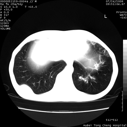 以下是引用zjzjr在2008-8-26 11:03:00的发言:[br]支持:肺癌并肺内,胸骨,胁骨,胸椎及肝内转移!另:左肺支气管扩张征伴感染!