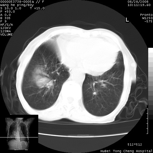 以下是引用随光逐影在2008-8-29 7:40:00的发言:[br]1)右肺中心型肺癌伴阻塞性肺炎,肺内转移。2)心包积液(少量)。