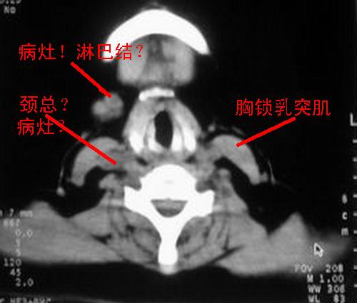 右侧胸锁乳突肌内侧略低密度结节,应该是静内静脉而不是淋巴结。