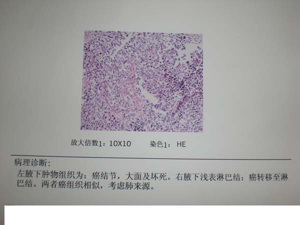 左腋下淋巴结病理结果:癌转移至淋巴结,考虑肺来源(肺癌)