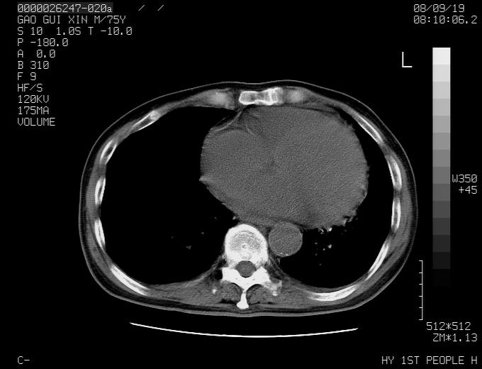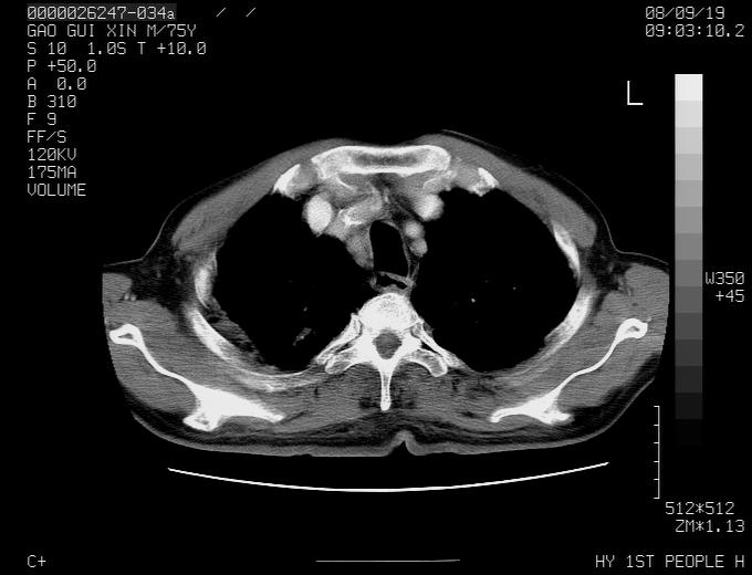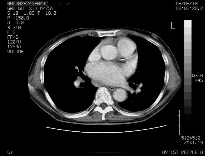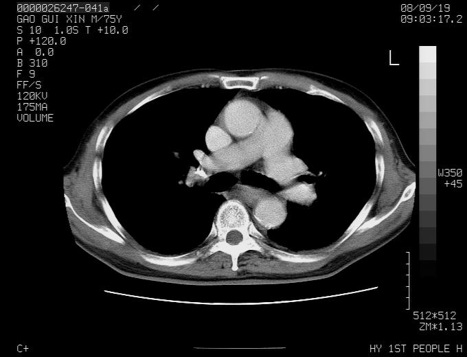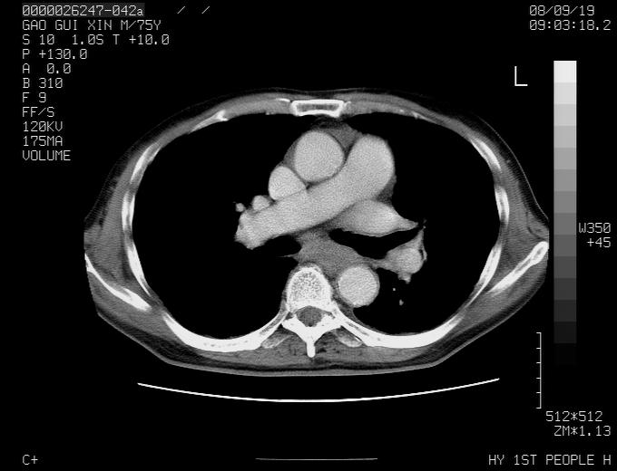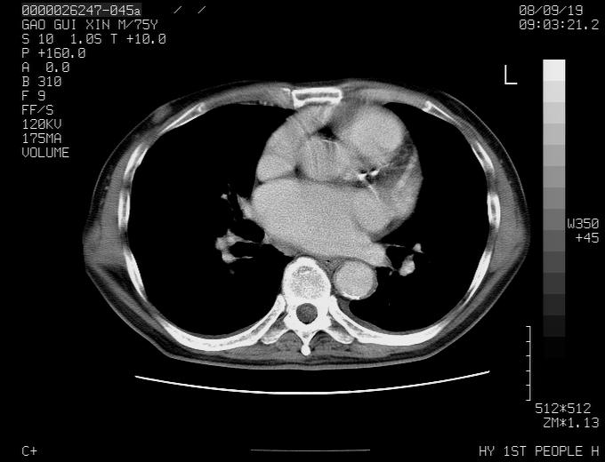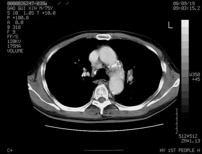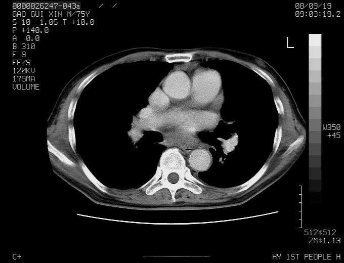 1)左肺上叶尖段周围型肺癌并纵隔淋巴结转移。2)冠状动脉及主动脉钙化。