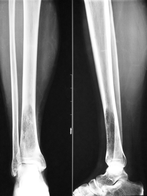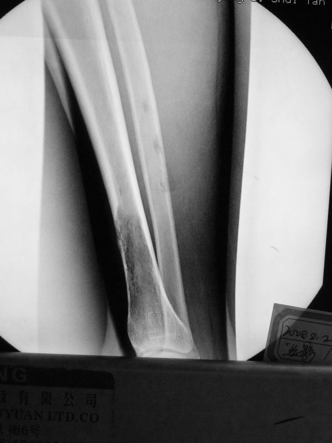 胫骨下端骨髓腔内局限性骨密度减低改变,边界模糊,骨皮质未见明显中断,结合病人多年的病史,考虑软组织良性肿瘤压迫吸收临近骨组织。建议mr或ct检查。
